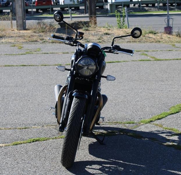 The new Speed Twin 900's flowing exhaust runs seamlessly from the stainless-steel headers to twin compact silencers with a matte black wrap and brushed stainless steel end caps. Every twist of the throttle unleashes an instant response and an evocative exhaust note. The High Torque Bonneville twin engine delivers 64 HP at 7,500 rpm and a satisfying surge of torque, producing 59 LB-FT at just 3,800 rpm. This strong mid-range power ensures every ride is exhilarating, whether you're navigating city streets or hitting the open road. - POWERFUL BRAKING PERFORMANCE