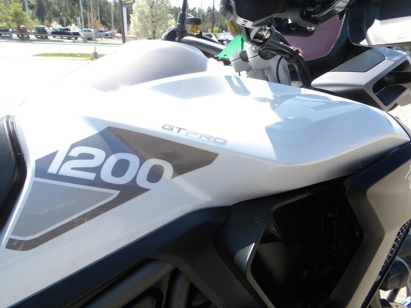 The 2025 Tiger 1200 GT Pro in Snowdonia White is a road-focused adventure motorcycle known for its refined engine, comfortable ergonomics, and advanced technology.