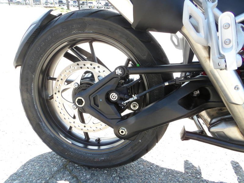 Brembo single piston caliper, OC-ABS, single 282mm disc. Rear master cylinder with remote reservoir.