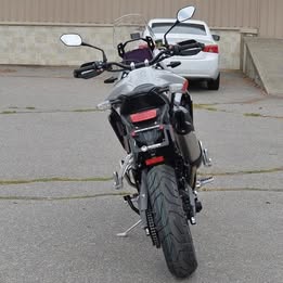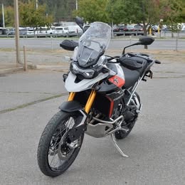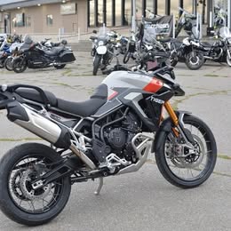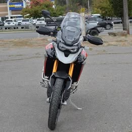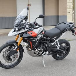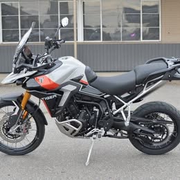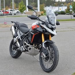 A top-tier adventure motorcycle designed for serious off-road riding, boasting a powerful 900cc triple engine, premium Showa suspension for exceptional handling on all terrains, a comfortable riding position, and aggressive styling with a rugged build, making it perfect for tackling challenging trails while still offering long-distance touring capabilities; the striking color combination of Ash Grey with pops of Intense Orange gives it a bold and eye-catching aesthetic.