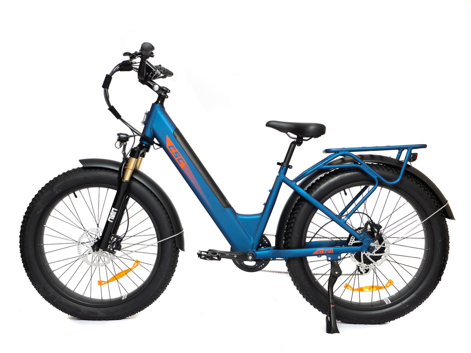 The lockable battery pack sends its energy to an intelligent brushless controller and then to a first-rate Bafang 750-watt motor mounted in the rear-wheel hub. Pedal-assist rates can be adjusted to five levels, while a thumb-operated throttle can power the FT750ST to 20 mph (max speed for Class 2 electric bikes) without even pedaling. Adding pedal power can boost maximum speed above 27 mph.