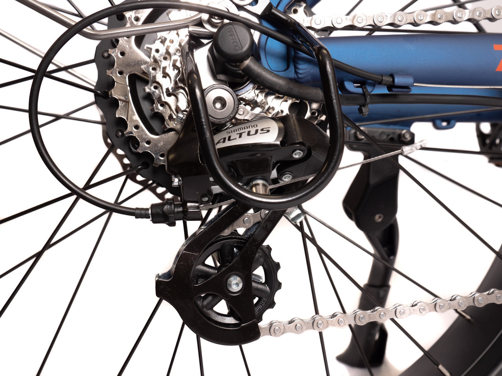The esteemed Shimano DMP brand is found on the 7-speed 11-34 Freewheel gear set and an Shimano Altus derailleur with adaptable gear ratios to tackle everything from steep hills to urban road speeds. The Shimano index shifter clearly displays which gear is selected. A dual-sided front sprocket guard ensures the chain remains on track even when ridden over rough terrain.