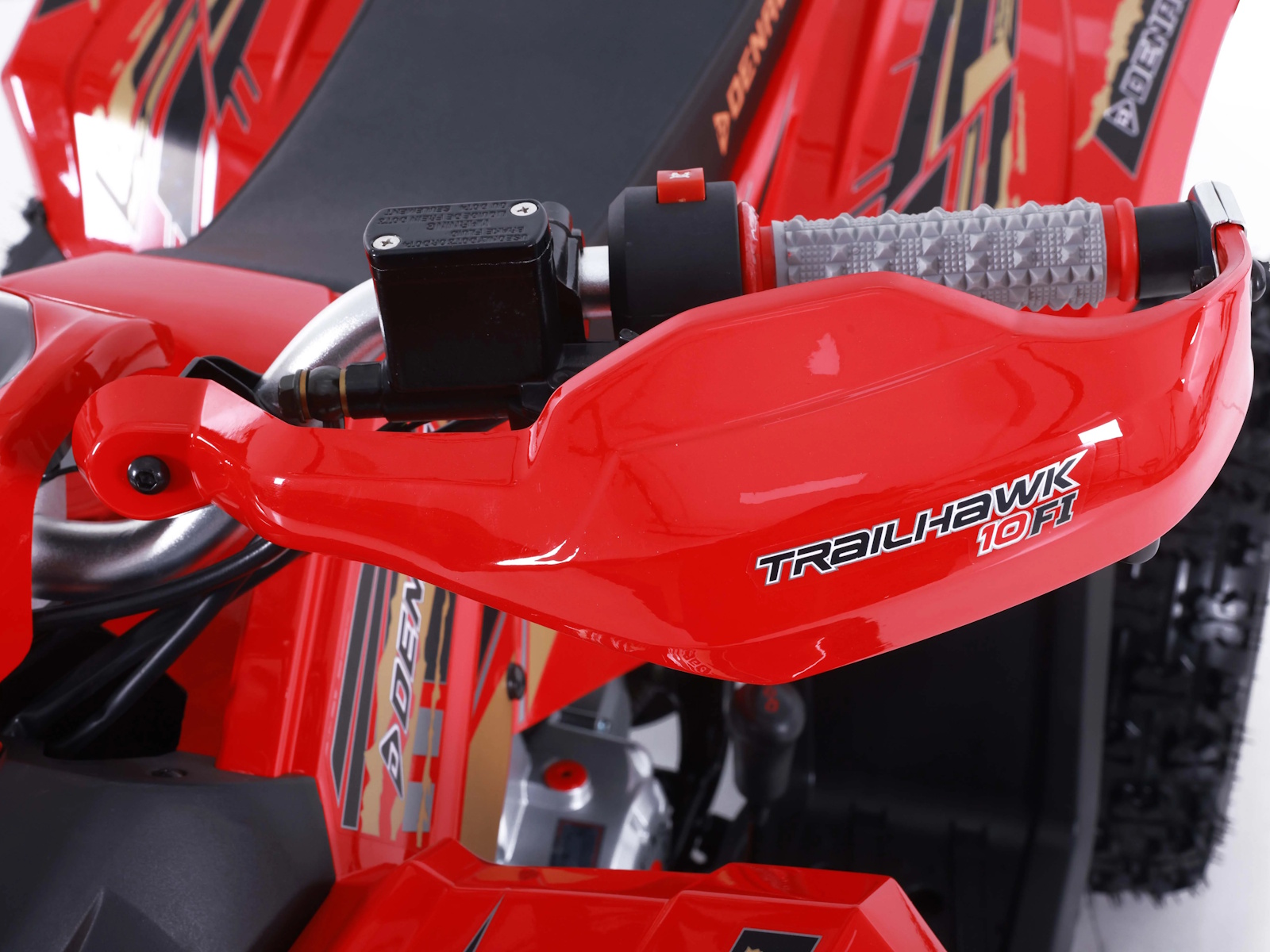 The Trailhawk 10FI is the sportiest Youth-10 ATV on the market, with independent double A-arm front suspension and adjustable shocks, a fuel-injected 120cc engine, electric starting, and sleek sporty style with color-matched handguards and grips. It’s available in 6 colors.