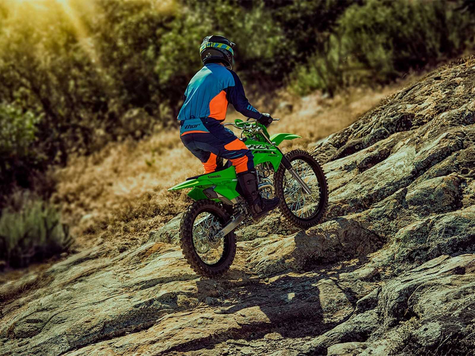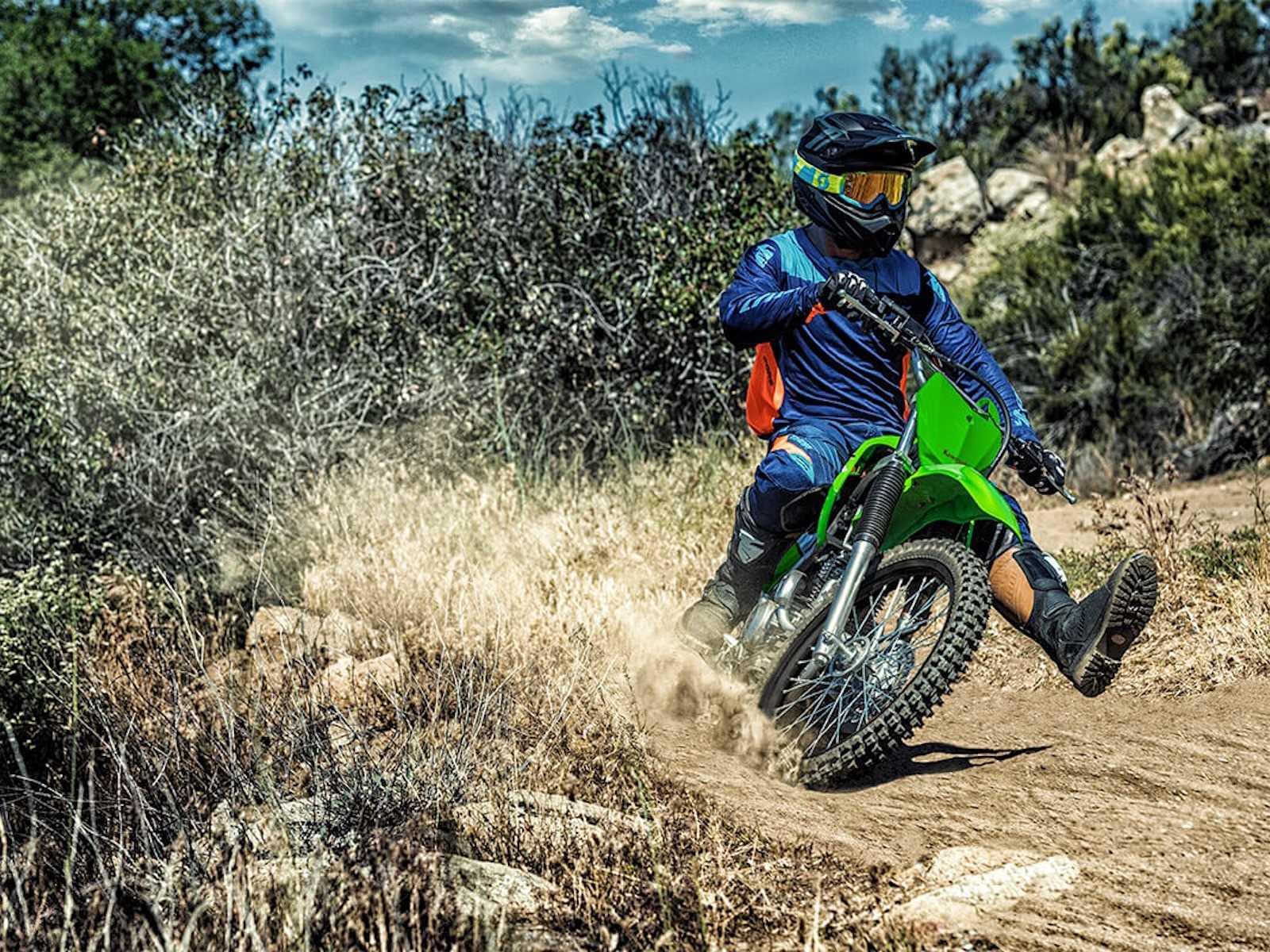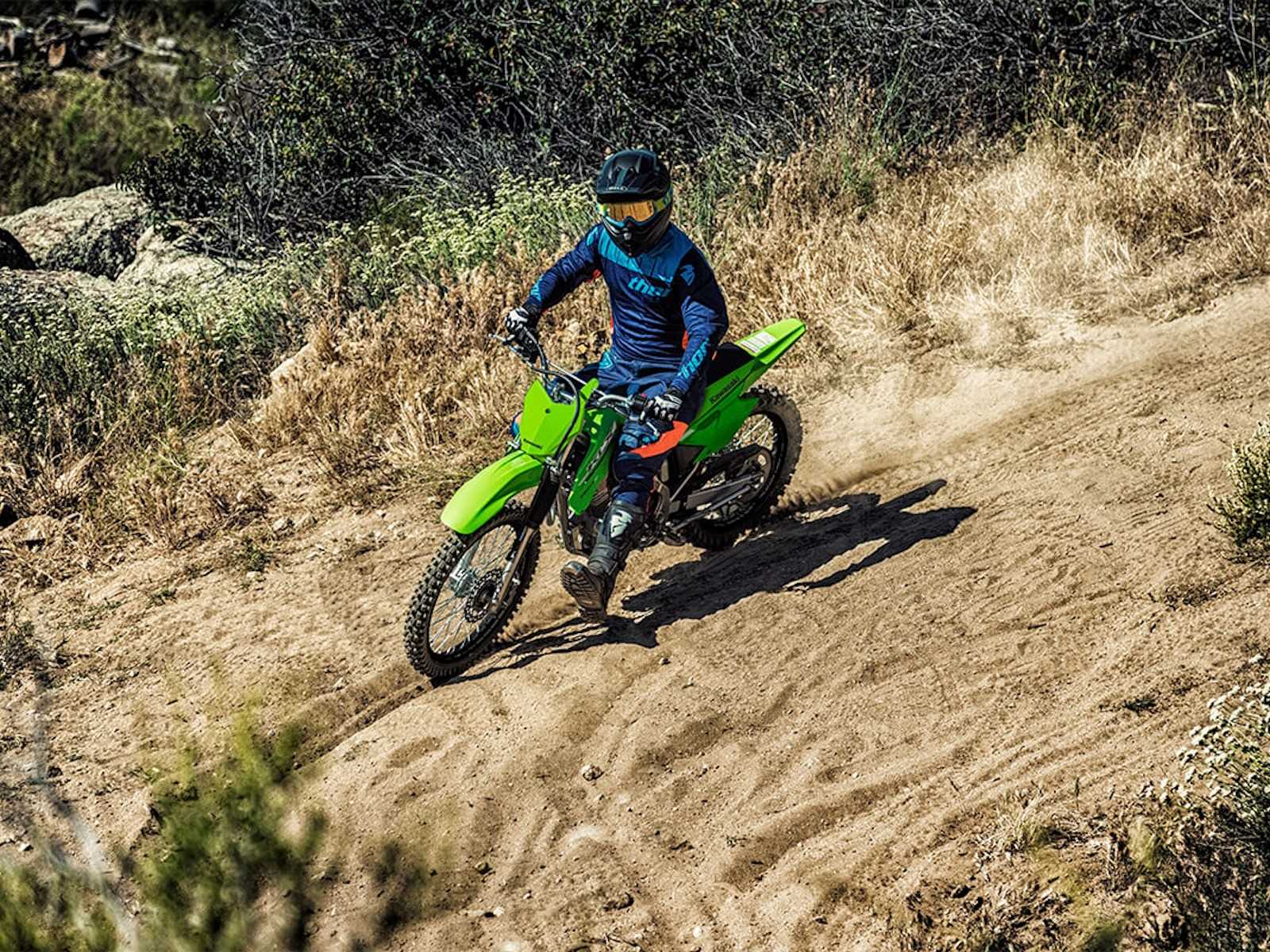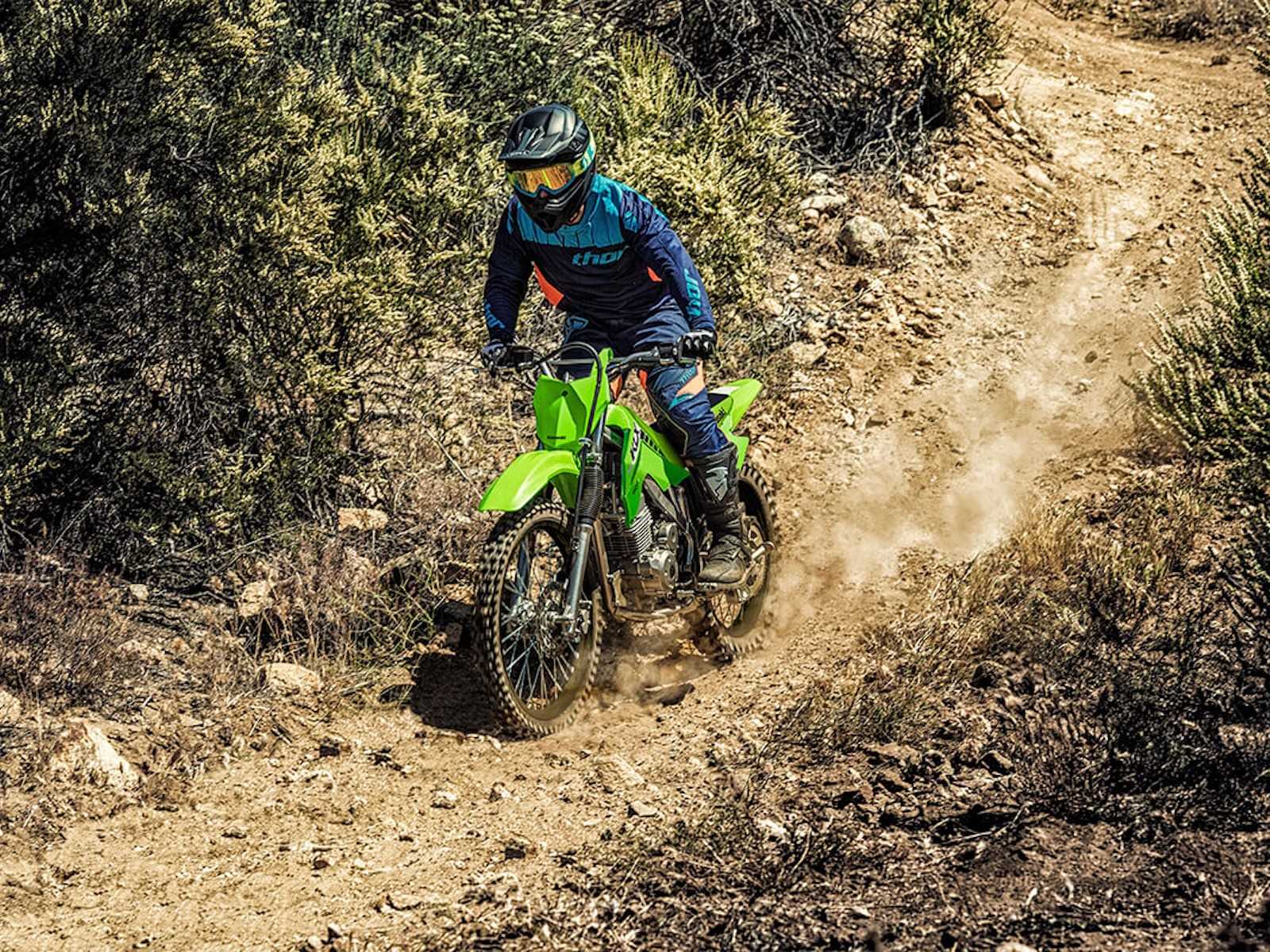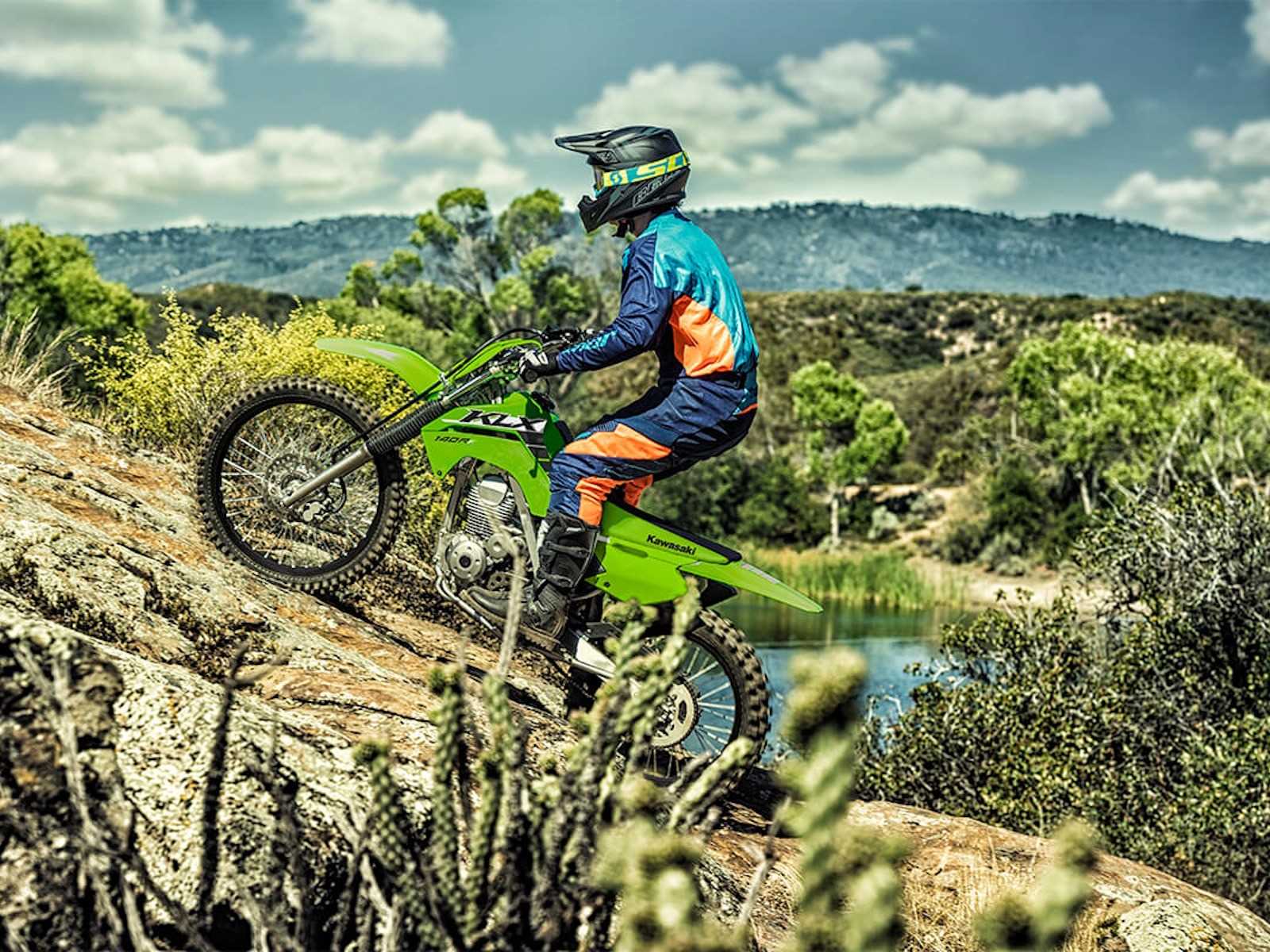 Featuring confident handling, KLX®140R motorcycles are the ideal entry into off-road riding. The easy-to-ride KLX140R lineup offers a 144cc engine, plush suspension, and push button electric start, making for great trailblazers.