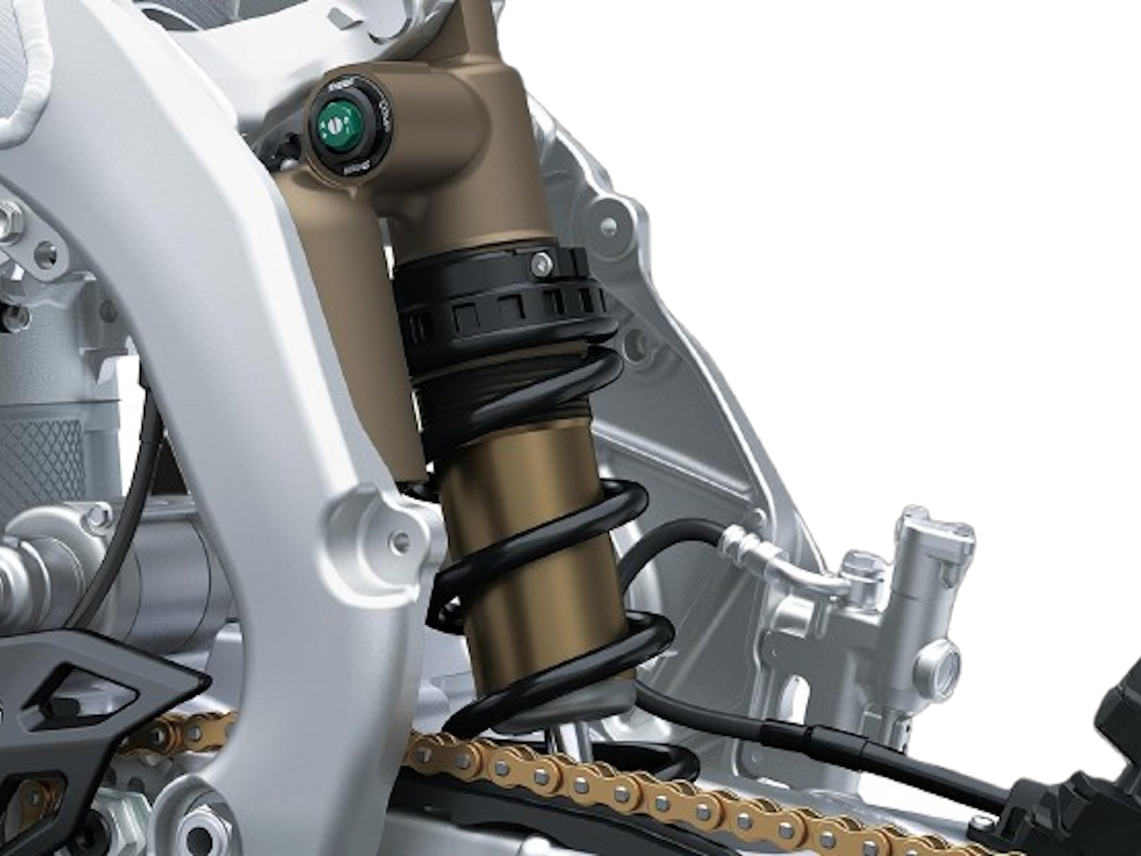 - The adjustable dual-range (high- and low-speed) compression damping, adjustable rebound damping, and adjustable preload come thanks to the new Uni-Trak® rear suspension system, featuring a Showa shock with Kashima Coating outer tube. The result is unmatched damping and rear-wheel traction.
