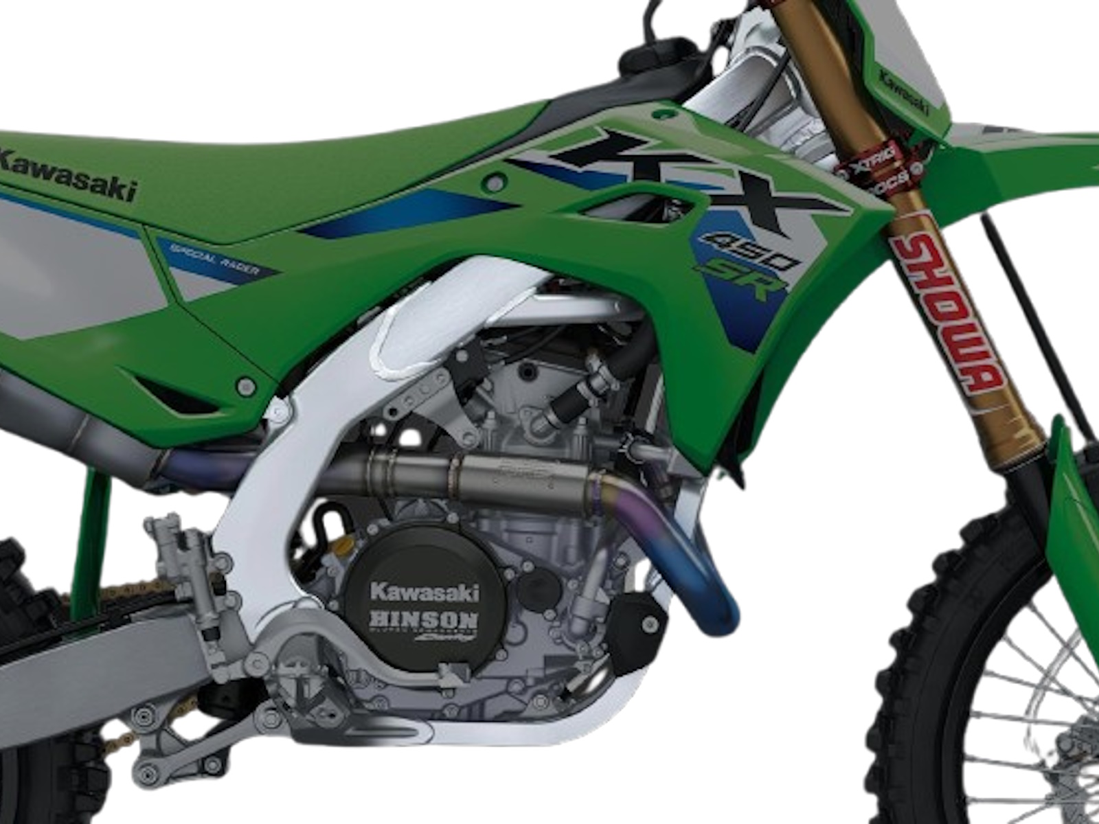 - Enjoy smooth action, firm damping, and optimal traction with the highly adjustable Showa suspension package on the KX™450SR motorcycle. The Showa suspension package on the KX450SR is inspired by the machines ridden by the Monster Energy® Kawasaki race team with optimized settings to achieve higher performance, smoother suspension action, and provide a plush feeling.