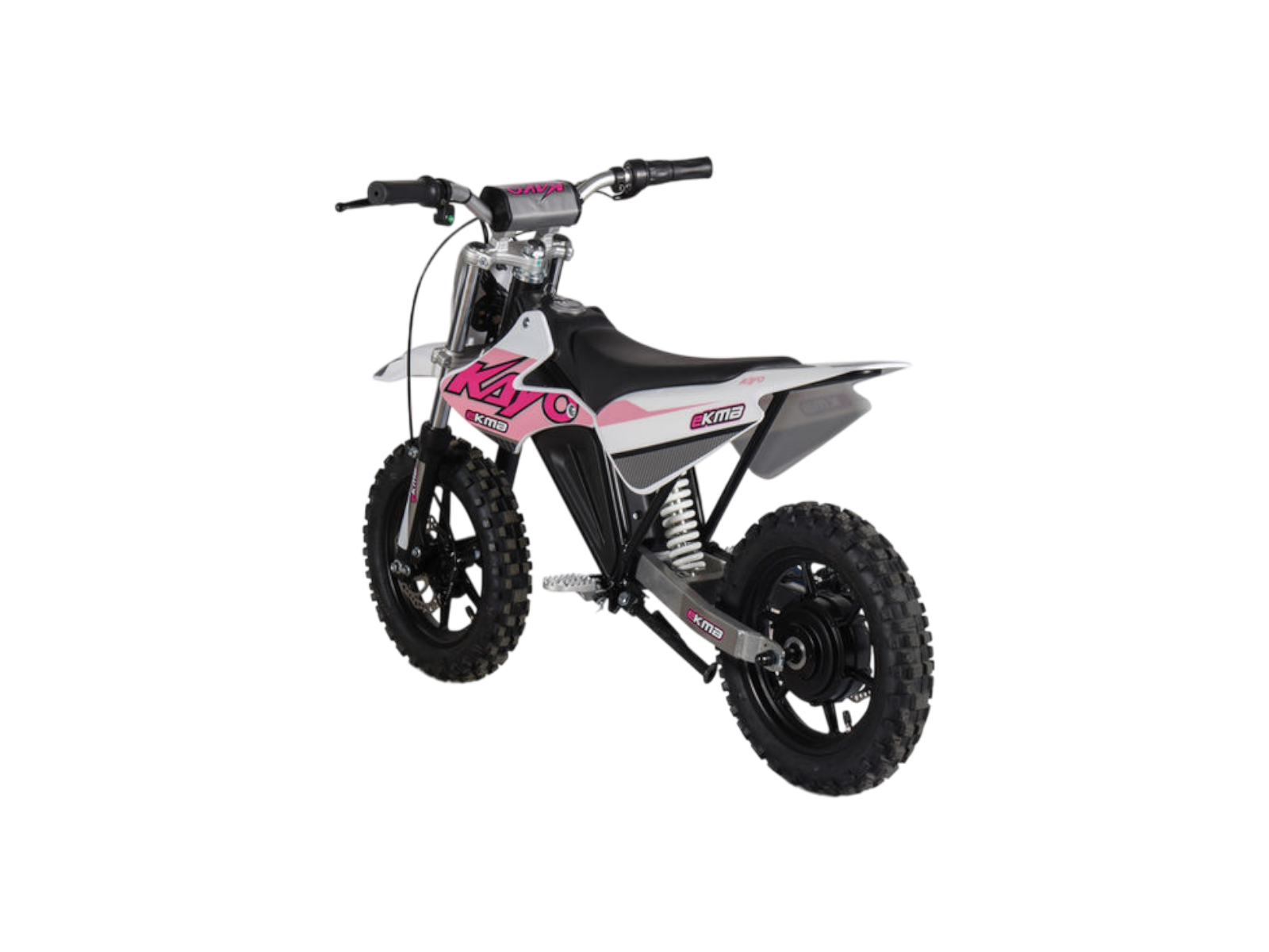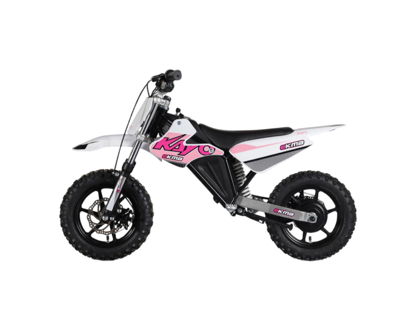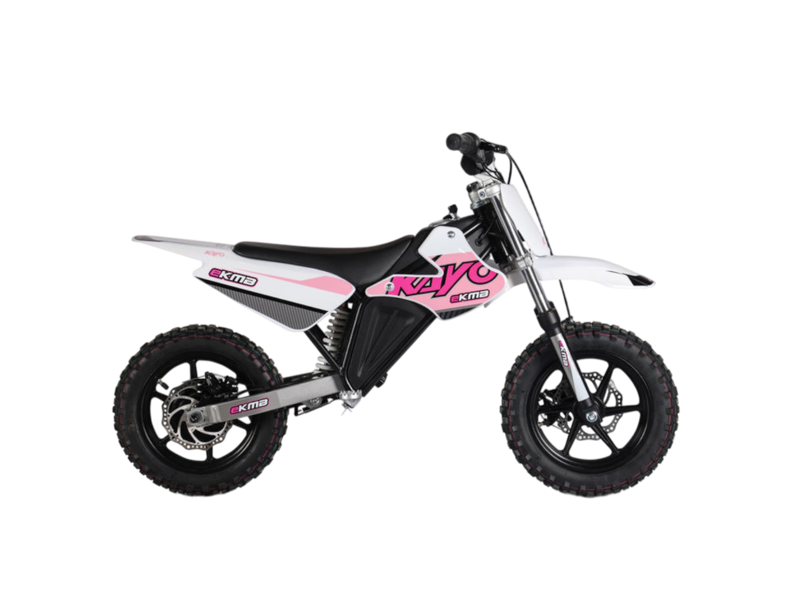The EKMB was designed to be the ultimate beginner bike aimed at kids who are just starting their two-wheeled journey. The low seat height of 21.25 inches and light weight design help inspire confidence as they begin to progress. Speed settings can adjusted on the fly and have a parental lock to make sure they don't advance through the speed settings without the approval of Mom and Dad. Disc brakes give this bike more than enough stopping power and even limit throttle input while under braking. Each unit comes with three full graphic kits, orange, green, and pink to help customize it. You can expect run times to last up to 70 minutes, when you are done, just stick it back on the charger and let it recharge. No more dirty air filters, carb adjustments, and oil changes. More riding, less maintenance!