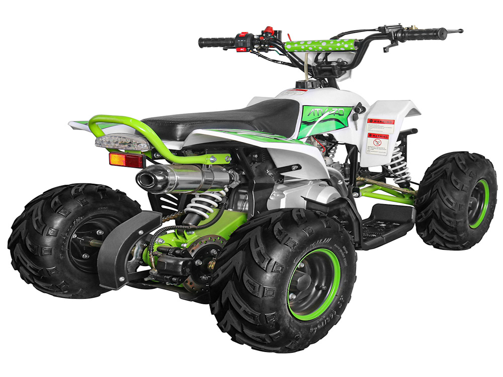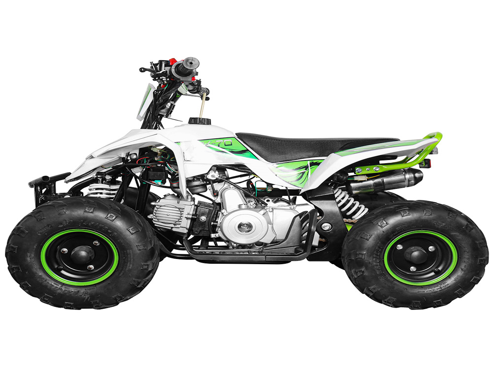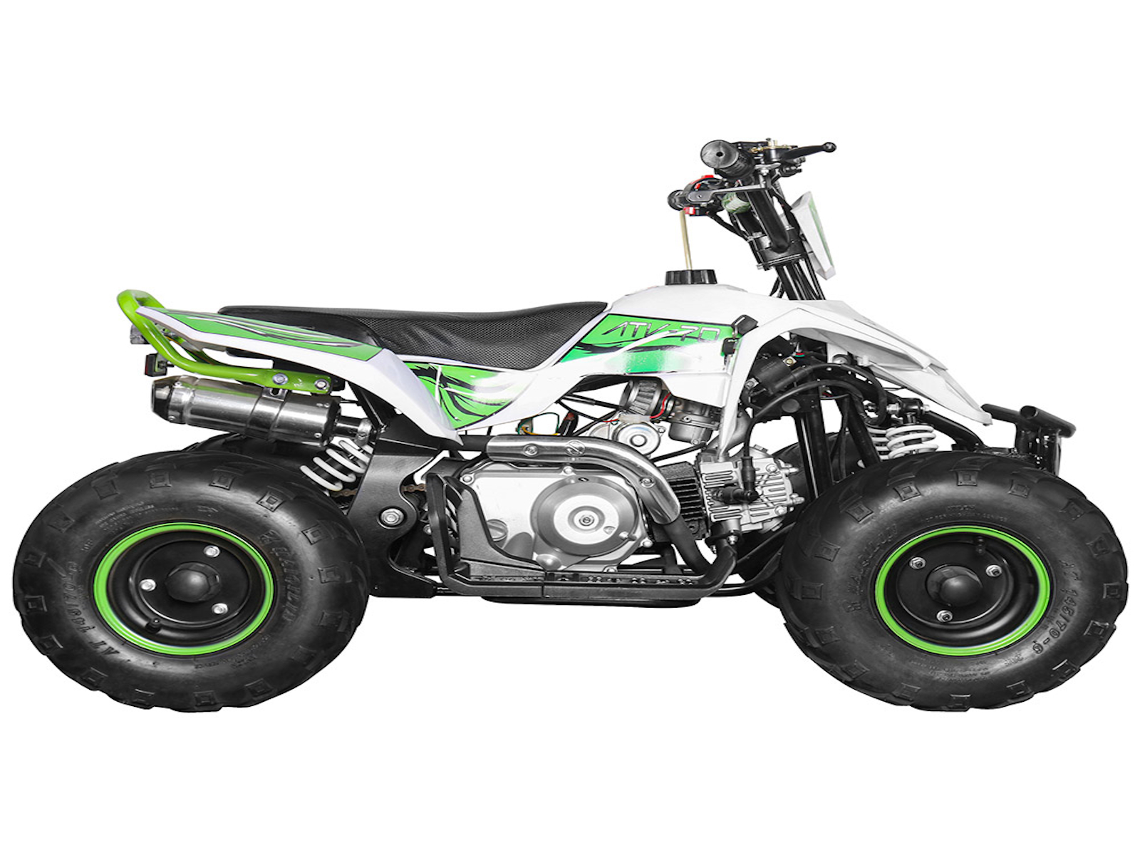 The 110cc Four Stroke, Single Cylinder, Air Cooled. The starting way is electrical start, used 12V 4Ah lead acid battery to start. The 110cc ATV drive is chain with chain tension and protector.