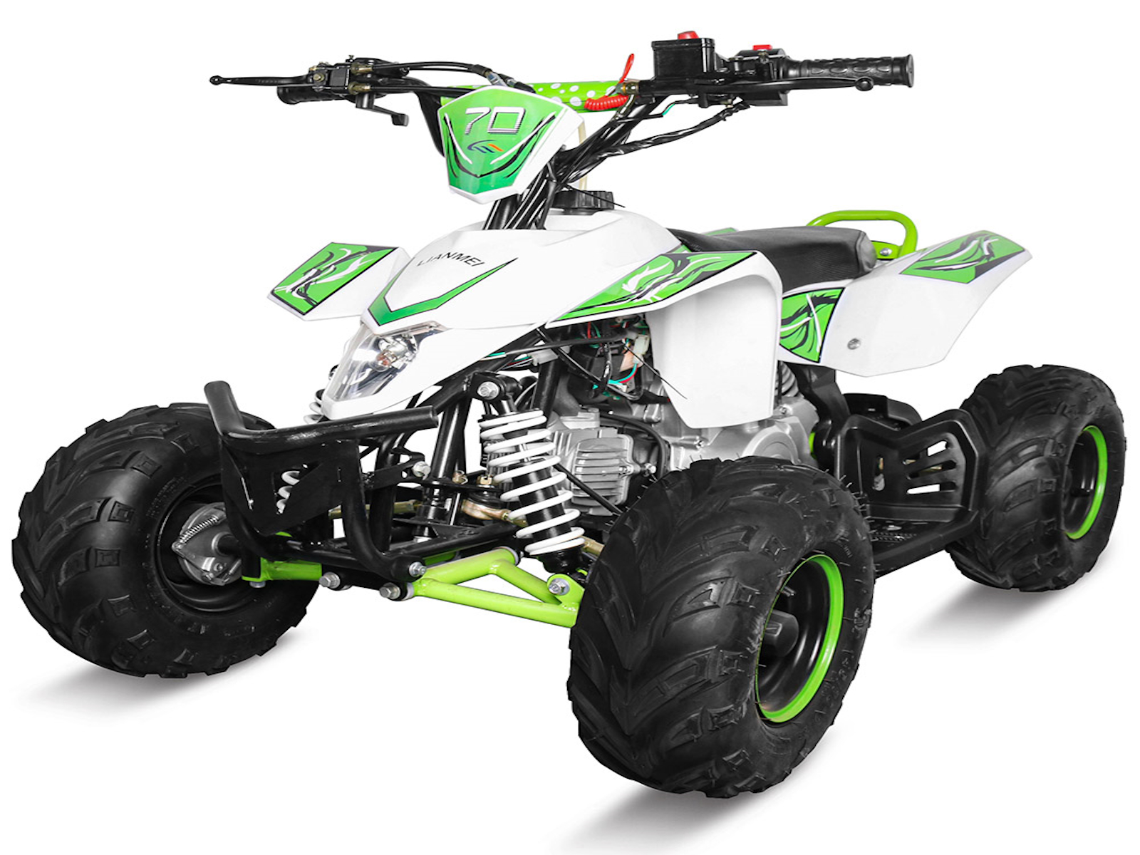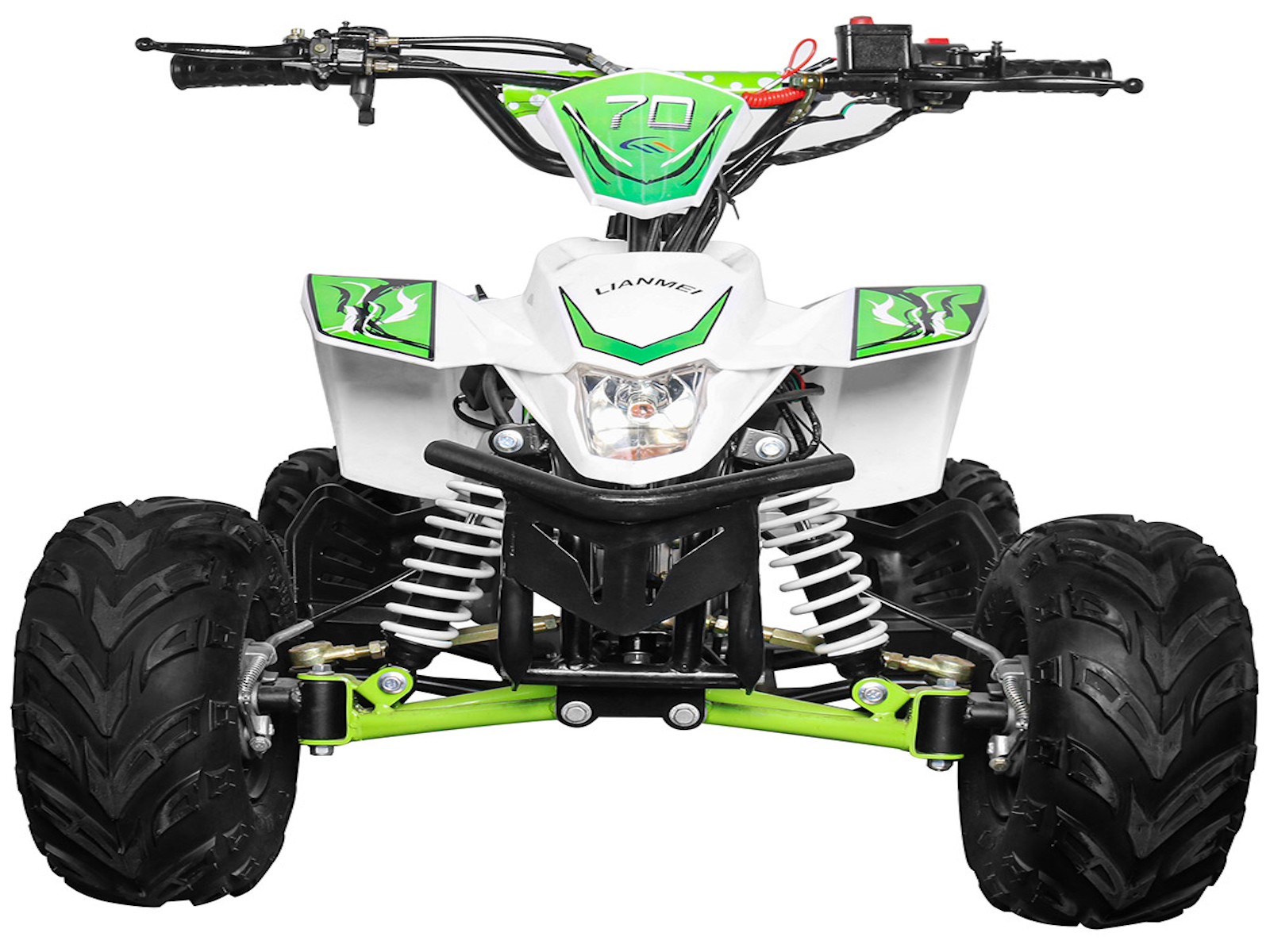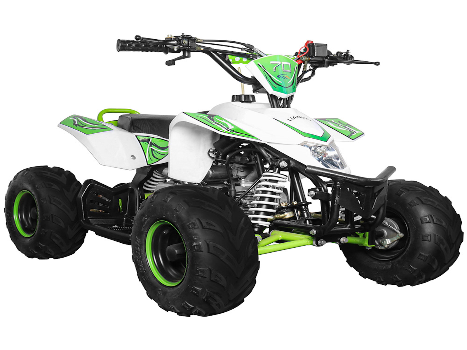 The 110cc Four Stroke, Single Cylinder, Air Cooled. The starting way is electrical start, used 12V 4Ah lead acid battery to start. The 110cc ATV drive is chain with chain tension and protector.