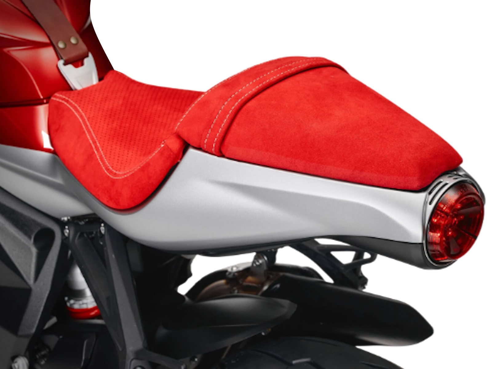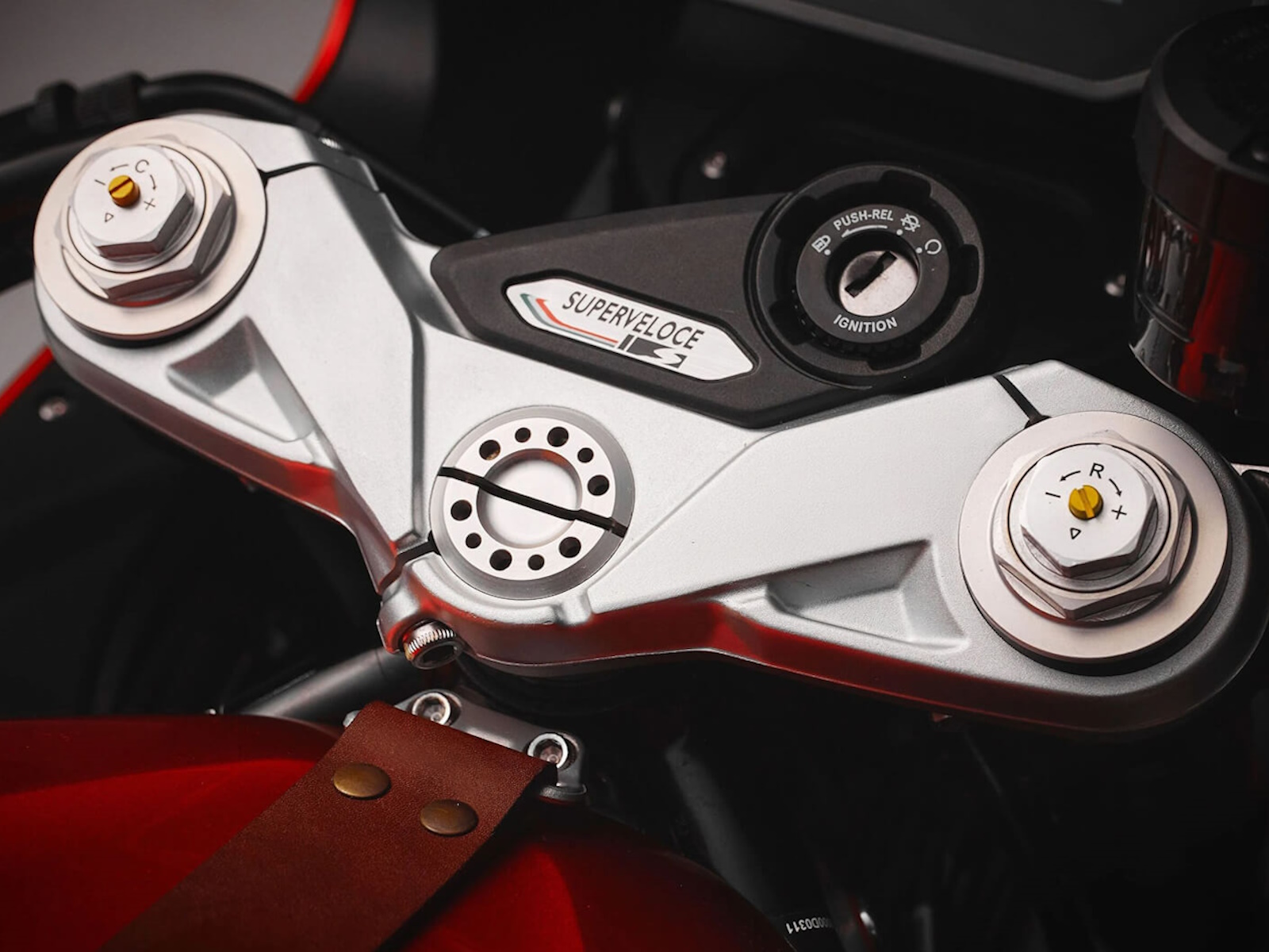 Every detail of the Superveloce S has been crafted with utmost care and refinement to bring the pinnacle of luxury to two wheels. Take, for instance, the Alcantara seat, which offers a soft, high-quality touch, or the leather strap that stretches elegantly across the fuel tank like the band of a fine timepiece, adding a further touch of exclusivity and beauty to the bike.