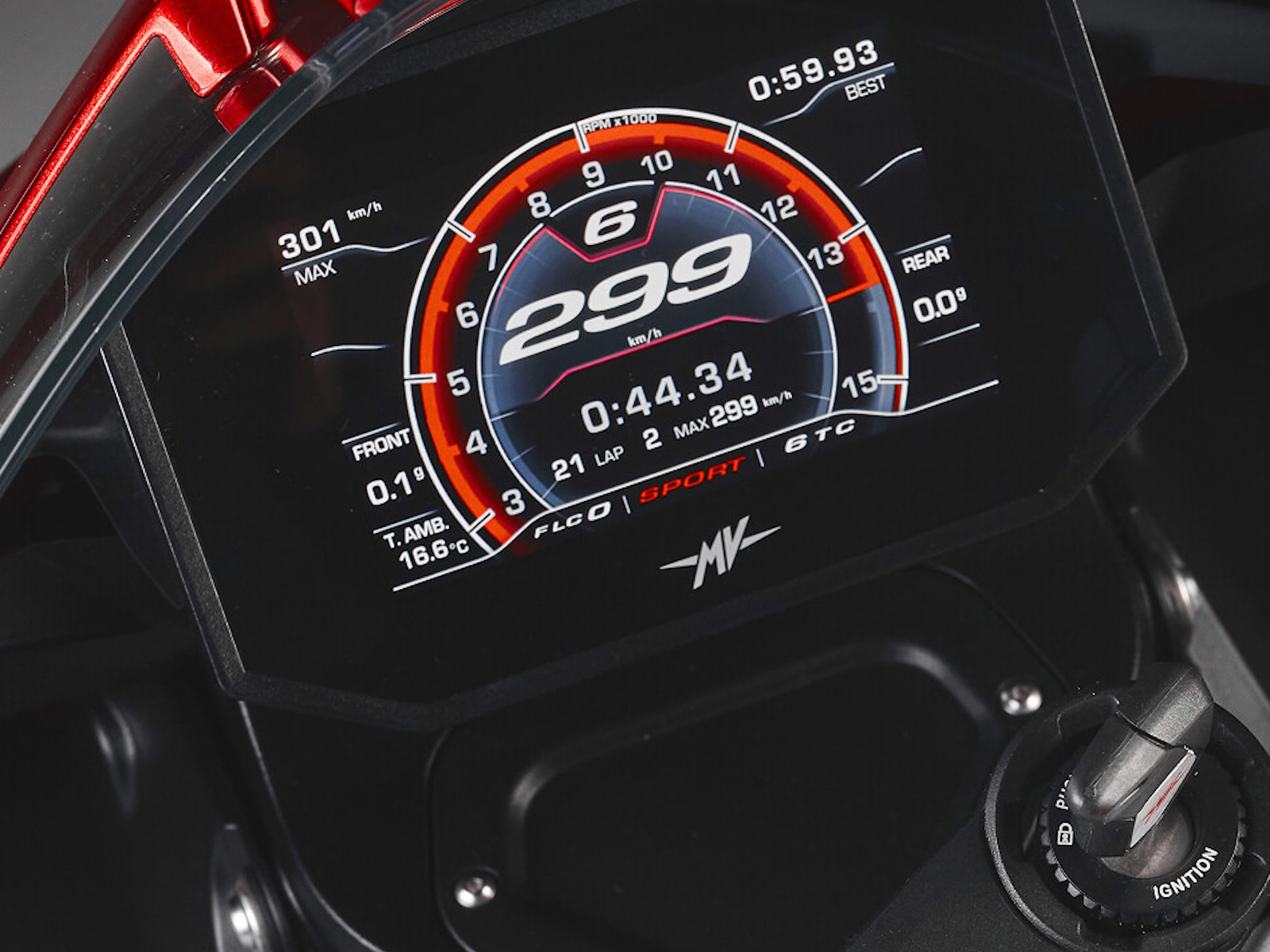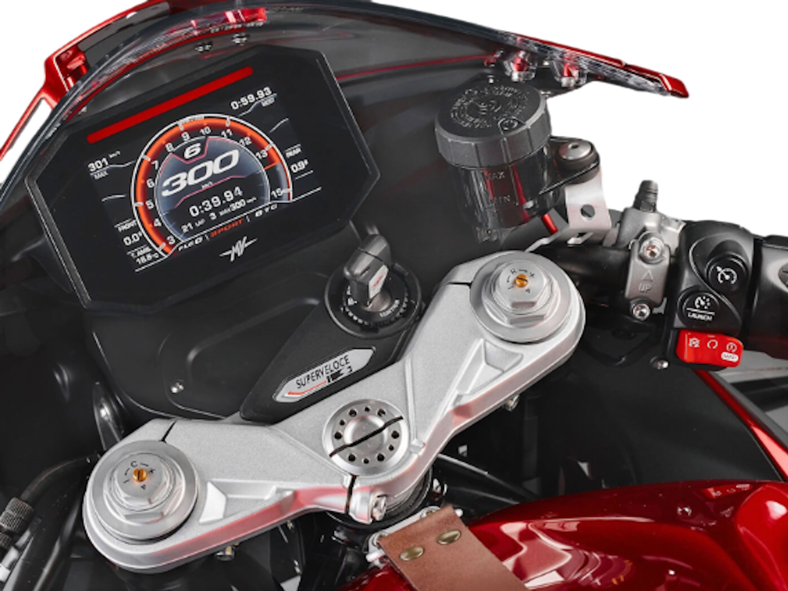 Titanium components: Intake and exhaust valves; Exclusive content: Dashboard TFT 5.5” color display - Cruise control Launch control - FLC (Front Lift Control) Bluetooth - GPS - MV Ride App for navigation mirroring, app-controlled engine, rider aids setup - Fuel Cap (with leather strap) - Alcantara rider and passanger seat - Advanced connectivity device “DC2 Connect”, integrated anti-theft system with geolocation - Certificate of authenticity