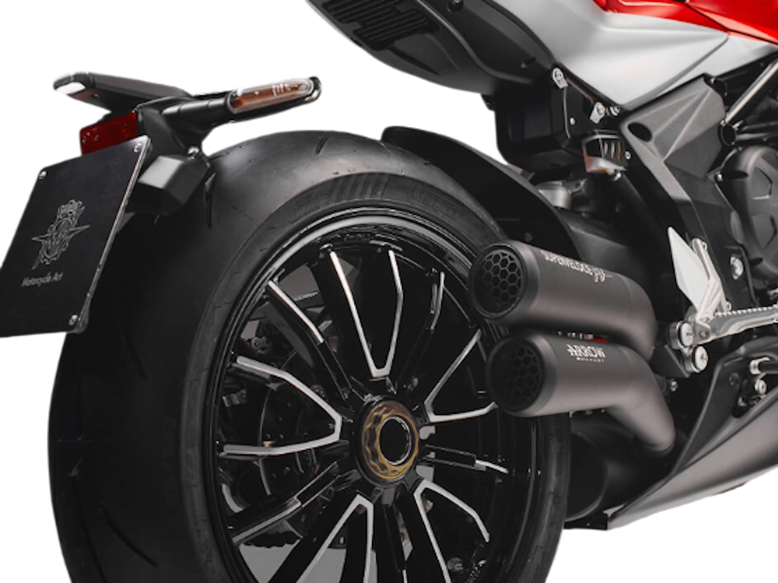 The Alcantara saddle enhances a bike that captivates with its style, design, and craftsmanship. The Superveloce S comes with a dedicated kit that includes a passenger seat cover matching the bike’s colour scheme, along with a 3-way Arrow exhaust boosting power to 153 HP.