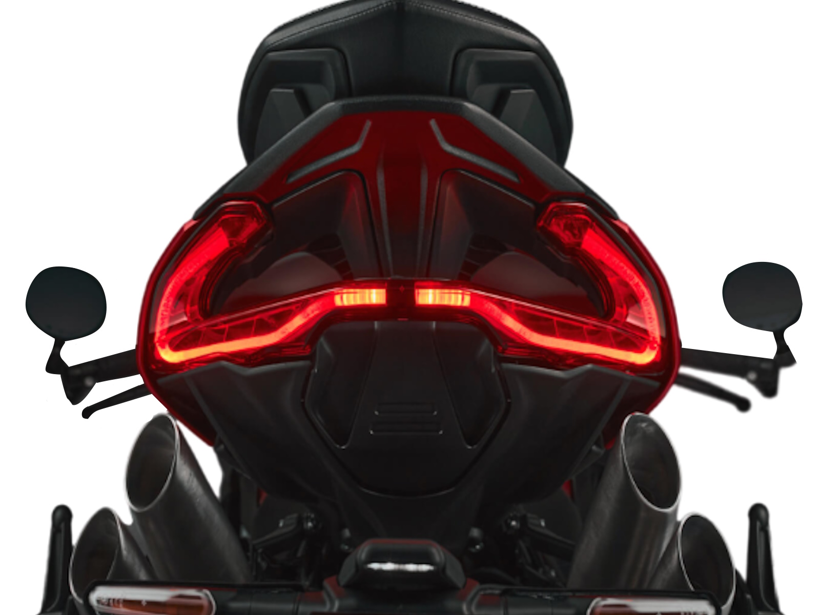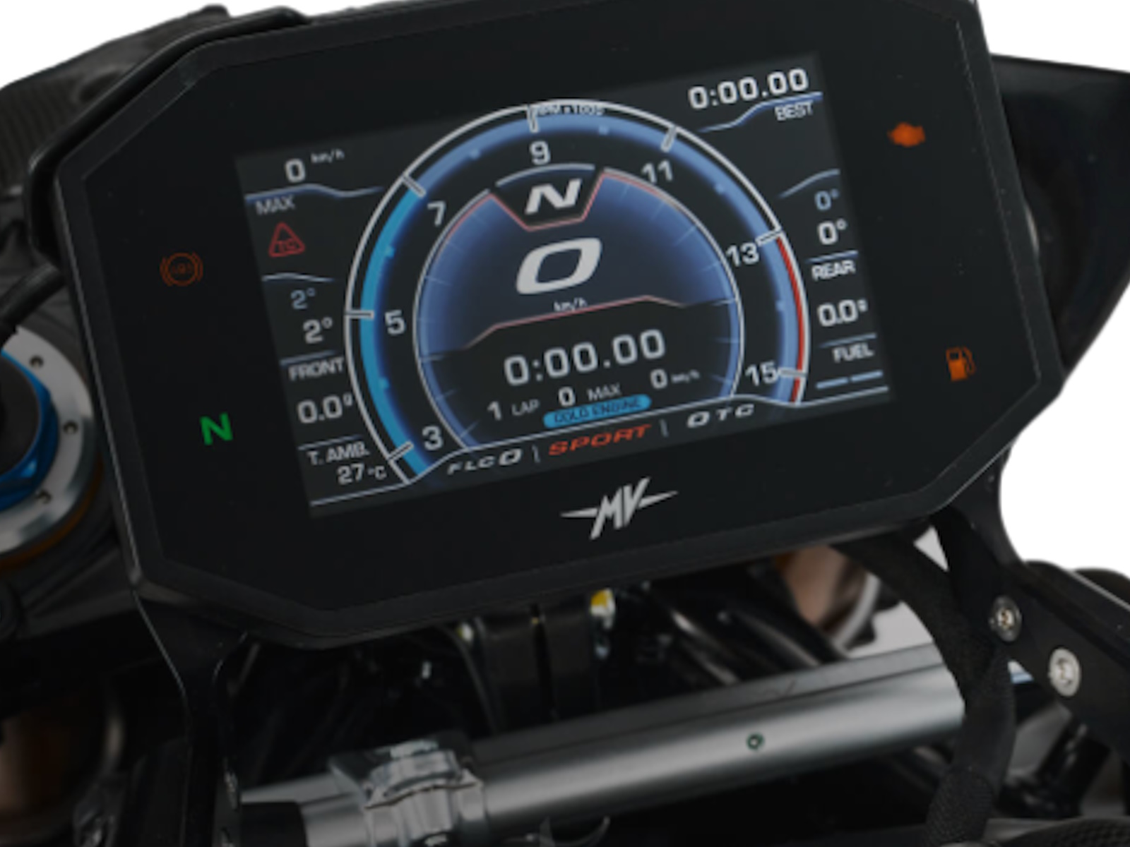 Lighter crankshaft - New combustion chamber Lighter pistons - Titanium connecting rods Dashboard TFT 5.5”color display - Cruise control Bluetooth - GPS - MV Ride App for navigation mirroring, app-controlled engine, suspension and rider aids setup - Launch Control - FLC Front lift control - Mobisat anti-theft system with geolocation