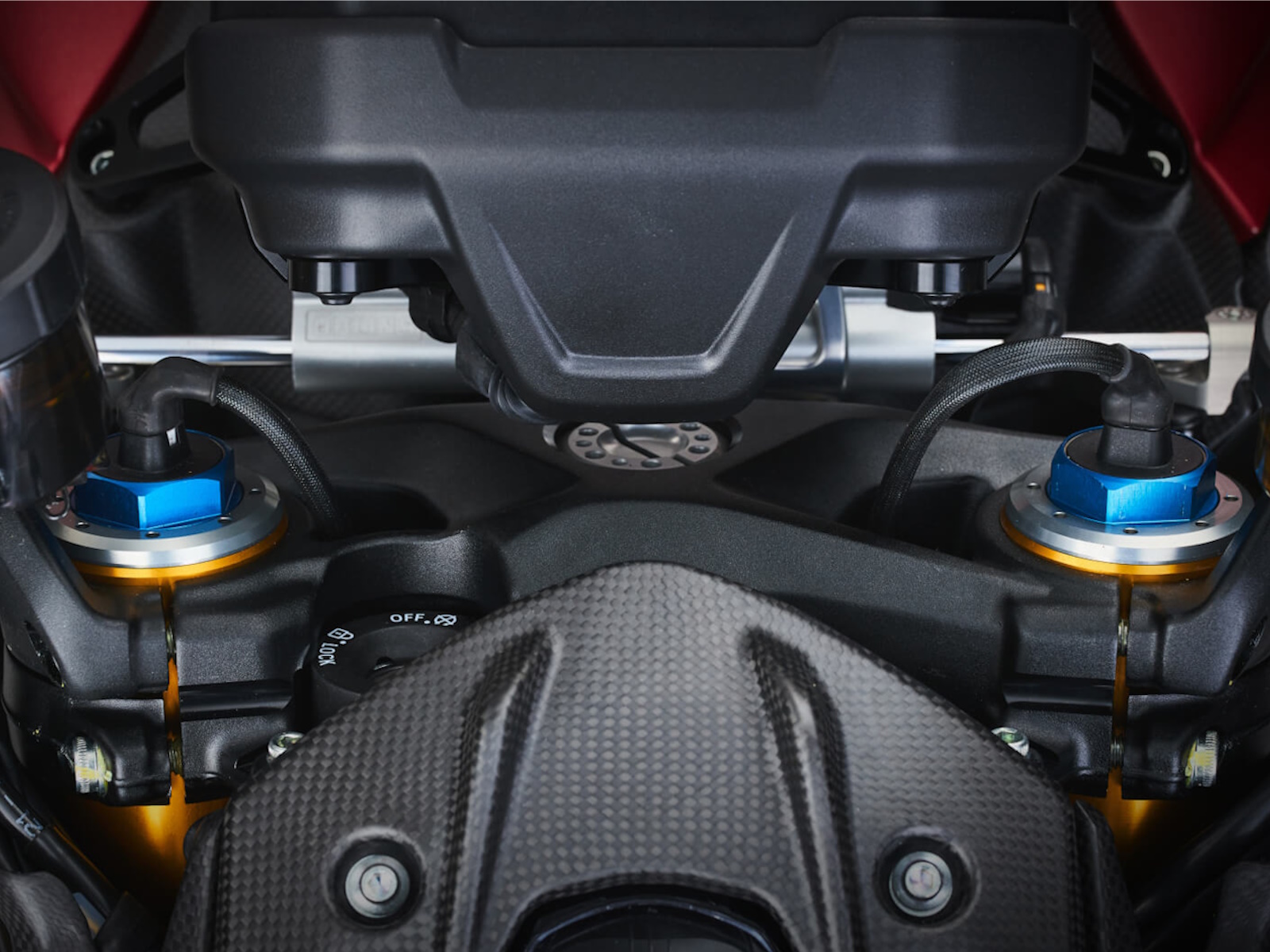 The exceptional power of 208 horses has been made even more exciting to handle thanks to the new camshaft timing, which optimises the torque curve at medium/low rpm. Efficiency has been improved thanks to the new transmission gears which reduce friction. The countershaft introduced into the four-cylinder’s crankcase spins at twice the speed of the drive shaft and reduces the high-frequency secondary vibrations by 54%. Increased reliability and more comfort. The transmission has been beefed up and the exhaust has a new main manifold.