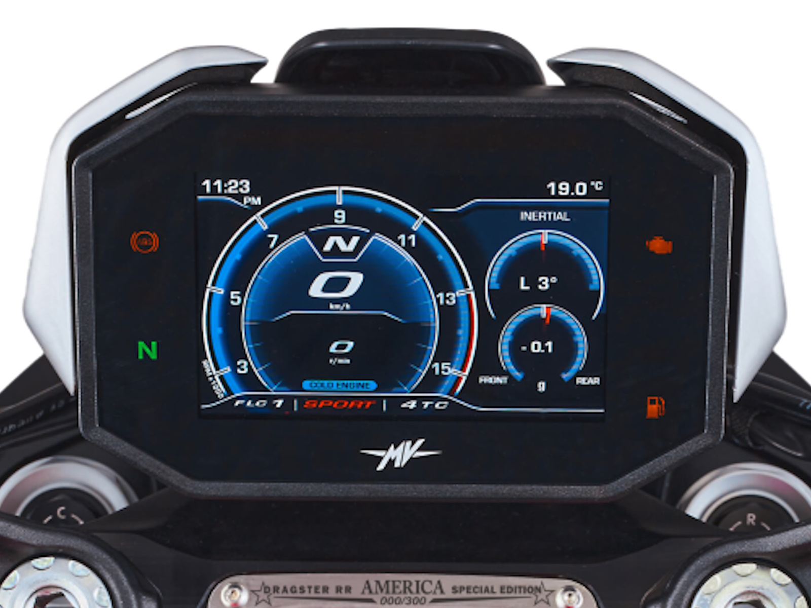 The Dragster America combines attention to detail, in line with that of a true special edition, with the technical base of a supersport, from the compact, powerful in-line three-cylinder engine to the SCS 3.0 clutch that eliminates the need to use the handlebar lever, and the MotoGP-derived counter-rotating crankshaft that reduces inertia when changing direction.
