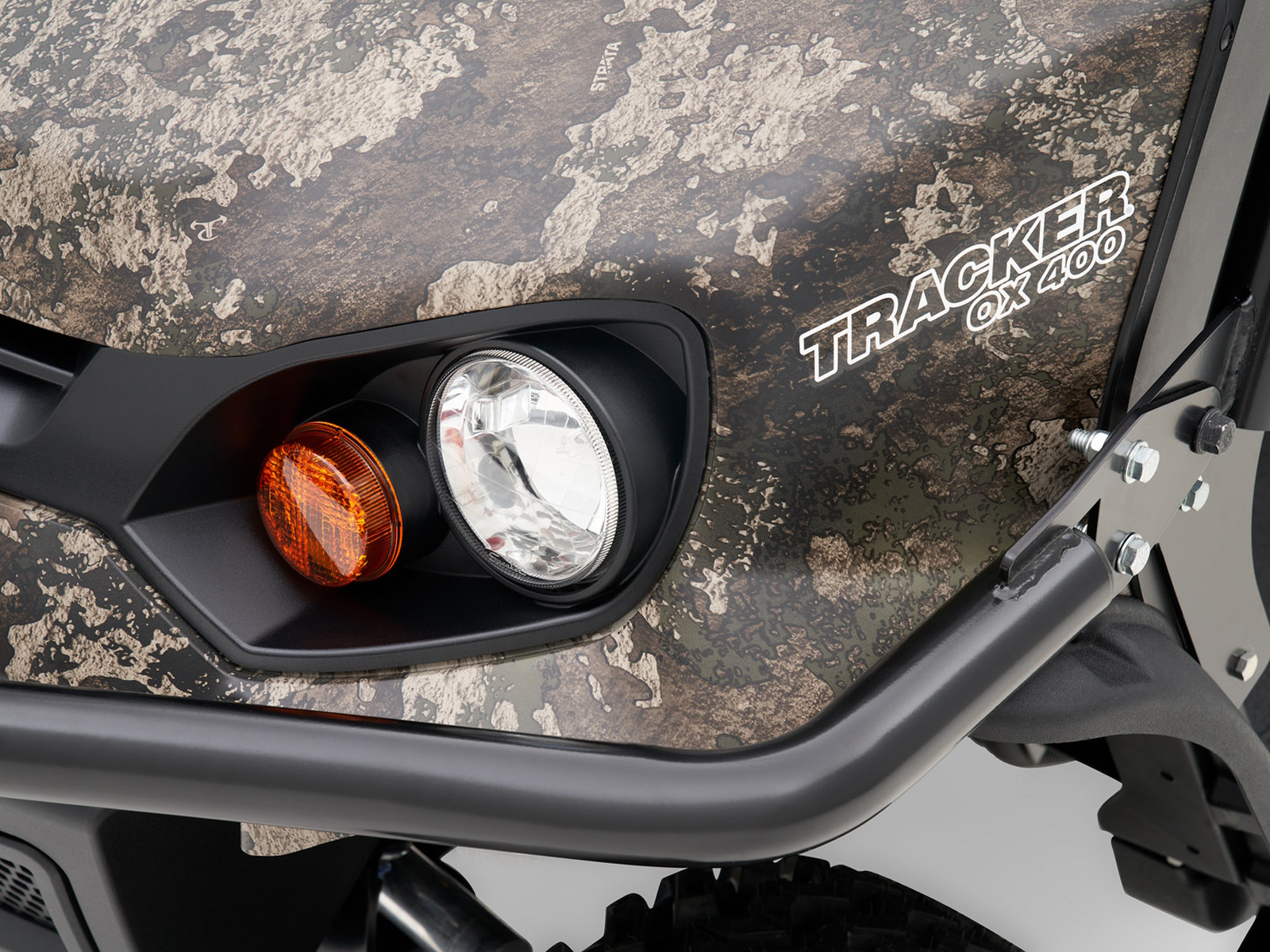 The TRACKER OFF ROAD OX400 is a crossover side-by-side that’s equally at home cruising suburban streets as it is playing in the dirt. Simple, comfortable, and reliable operation gets a dose of off-road prowess by way of a lifted suspension, knobby tires, and a rugged all-weather interior. A 401cc engine delivers exceptional economy and spunk that gets you moving up to 17 MPH. To top it off, the OX400 is fed by a class-leading 6.65-gal. gas tank for the greatest range on the market.
