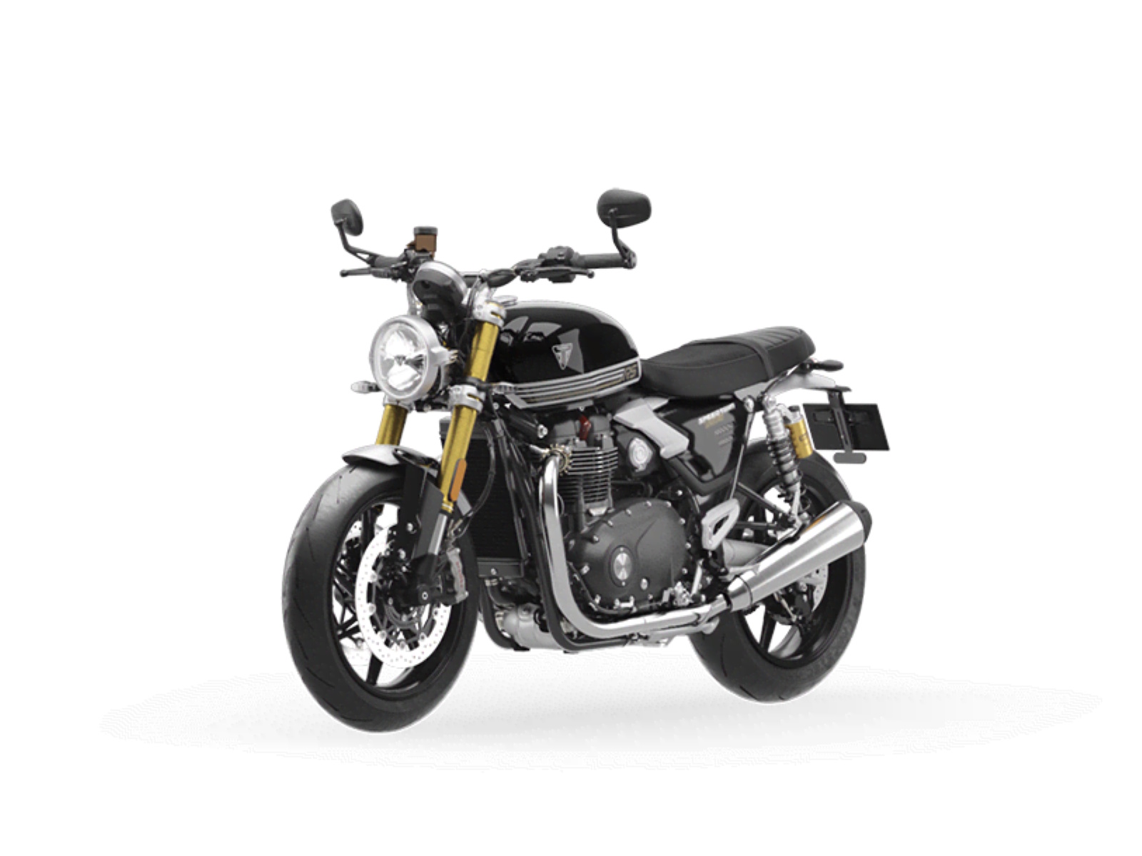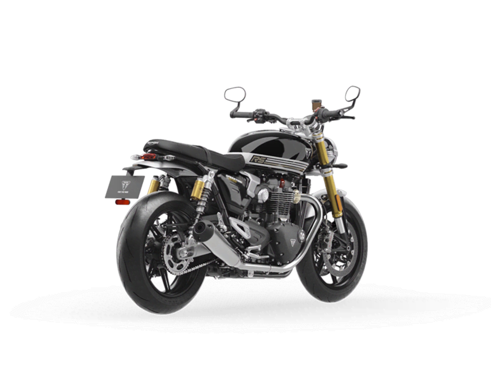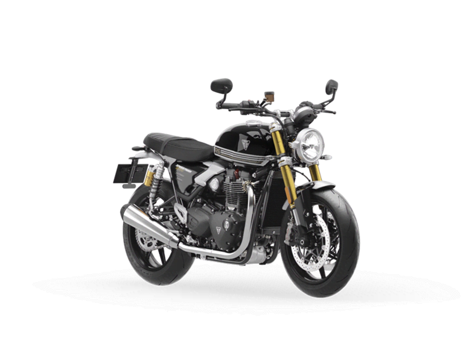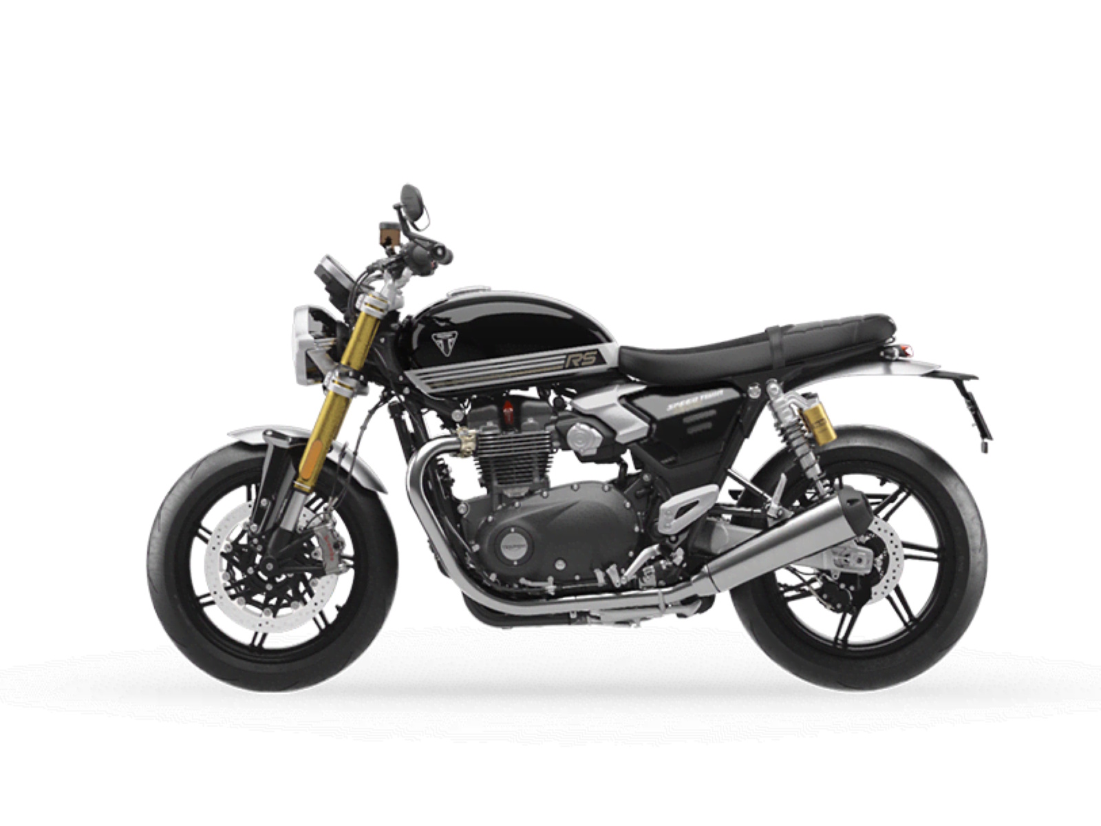 Stunning and uncompromising, the all-new Speed Twin 1200 RS signals its sporting intent with its nose-down attitude, top-specification suspension components, beautifully finished in gold and a premium suede material for the seat. The raked fuel tank, with its deep front cutouts, is chiseled and muscular, while the minimal throttle body covers are finished in brushed aluminum and integrated seamlessly into sculpted side panels within the slim rear frame. Underneath, the lean, angular engine casings are powder-coated black and framed by an uninterrupted exhaust run flowing into twin upswept ‘megaphone’ silencers.