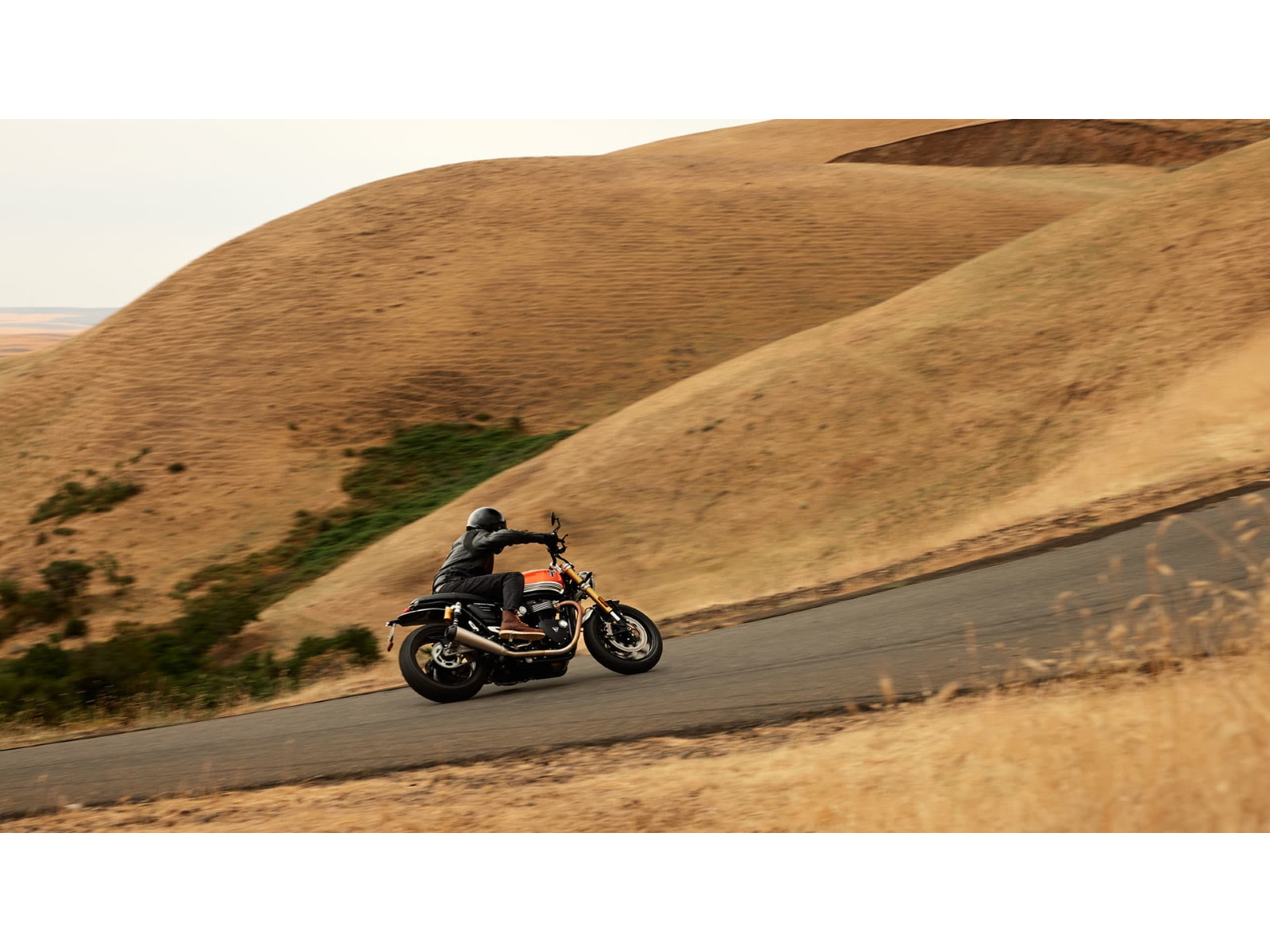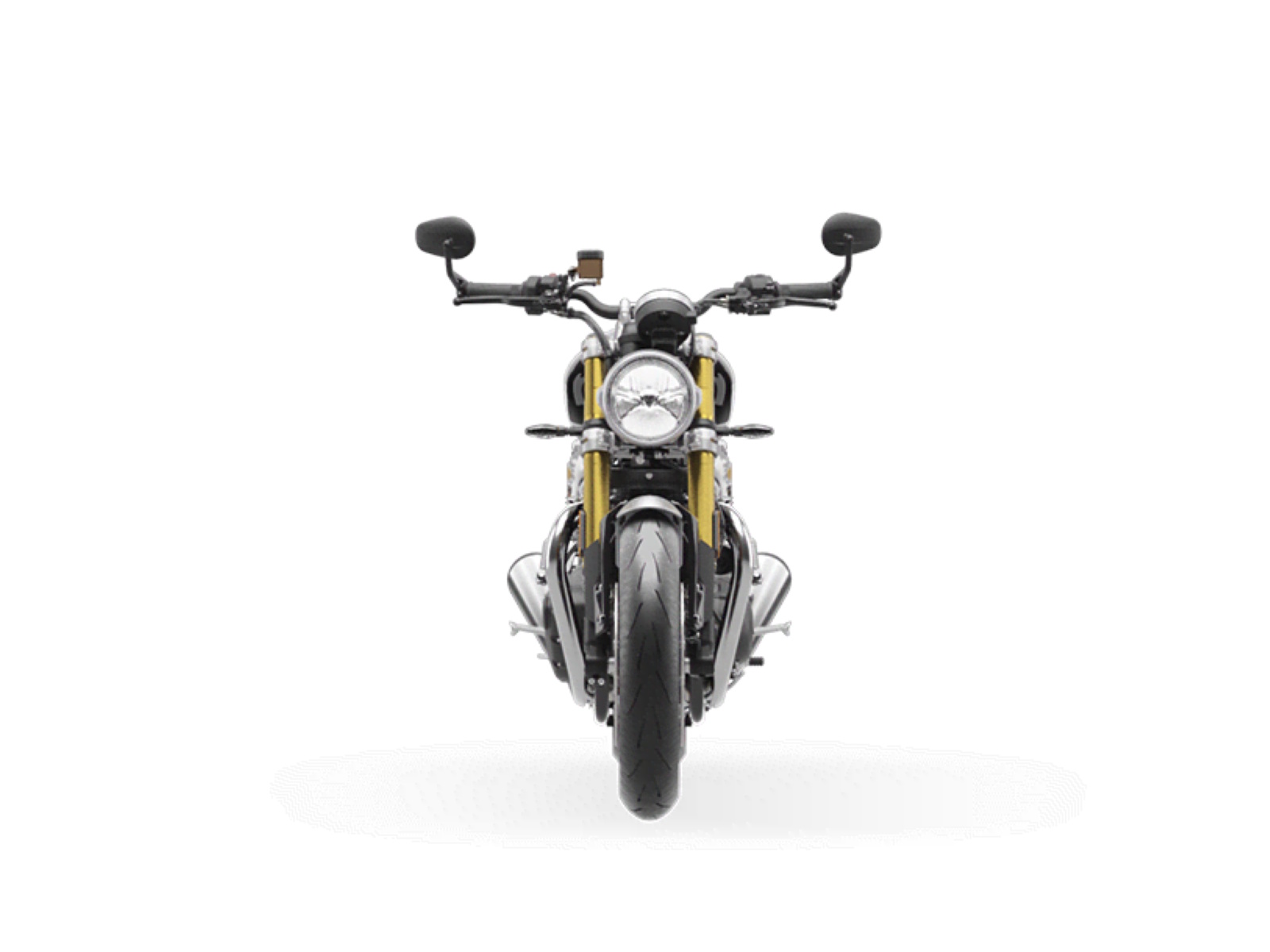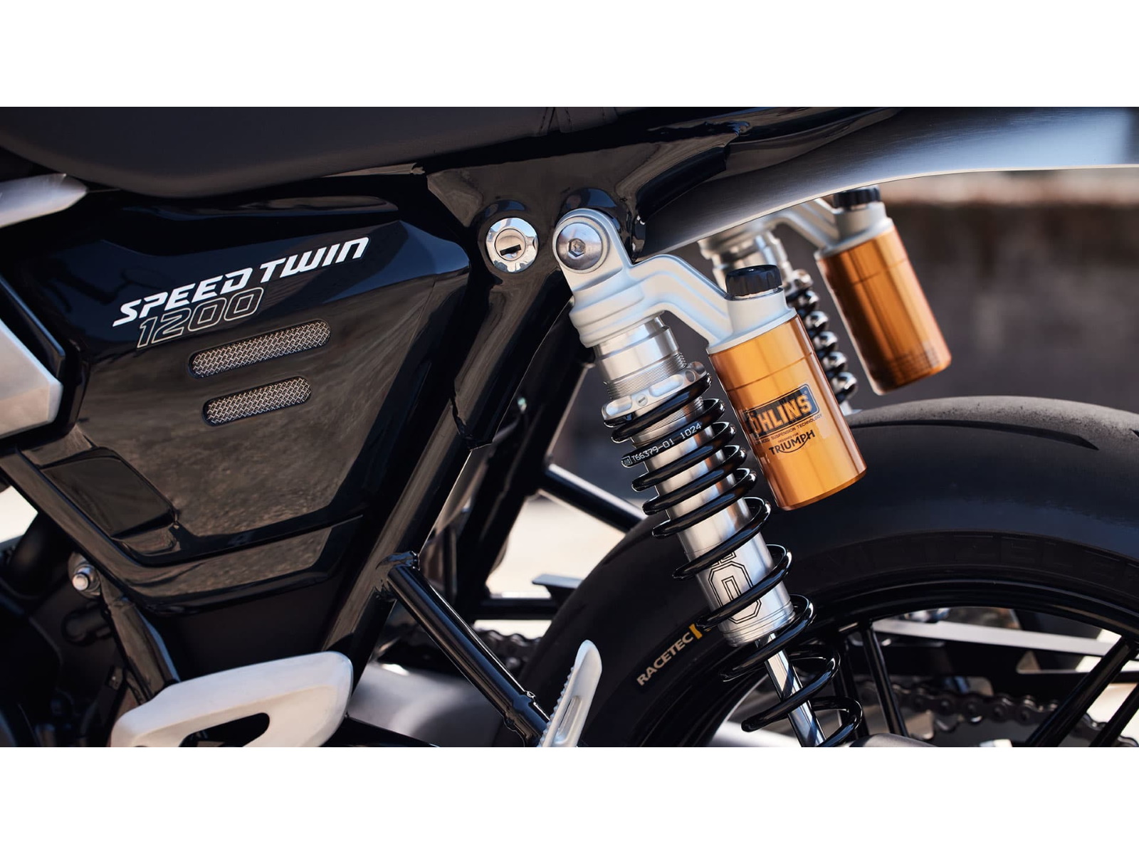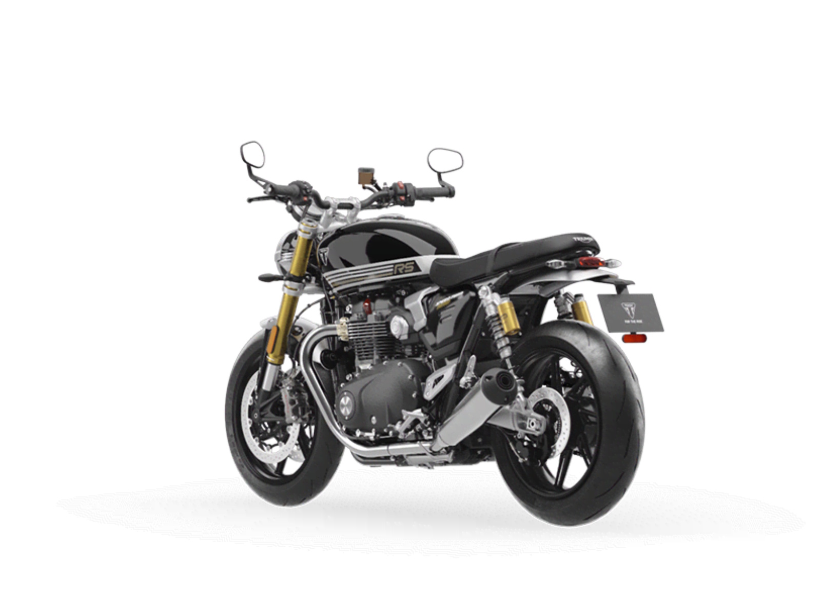 Stunning and uncompromising, the all-new Speed Twin 1200 RS signals its sporting intent with its nose-down attitude, top-specification suspension components, beautifully finished in gold and a premium suede material for the seat. The raked fuel tank, with its deep front cutouts, is chiseled and muscular, while the minimal throttle body covers are finished in brushed aluminum and integrated seamlessly into sculpted side panels within the slim rear frame. Underneath, the lean, angular engine casings are powder-coated black and framed by an uninterrupted exhaust run flowing into twin upswept ‘megaphone’ silencers.
