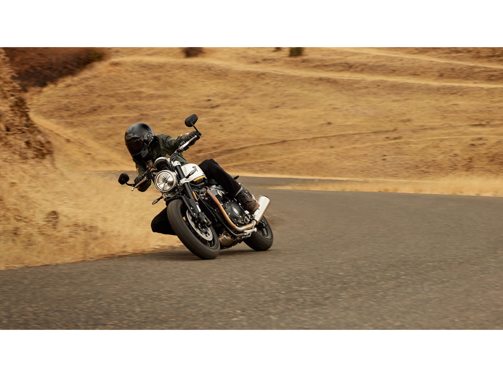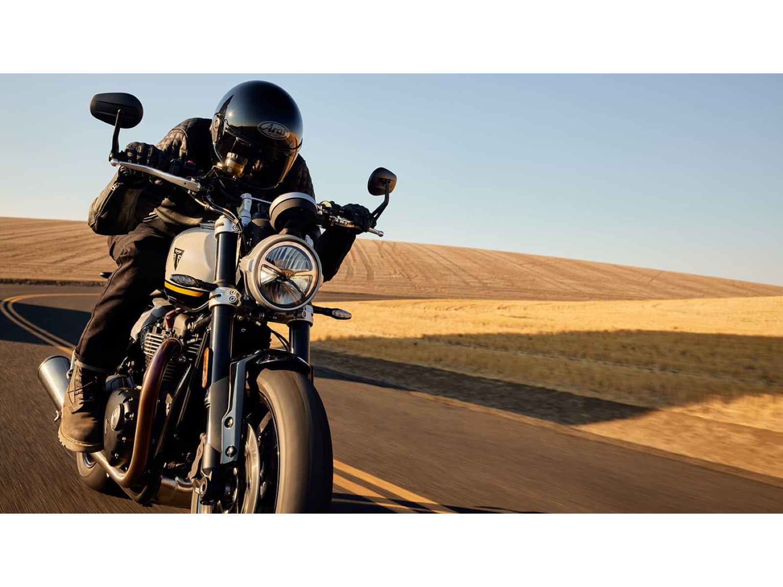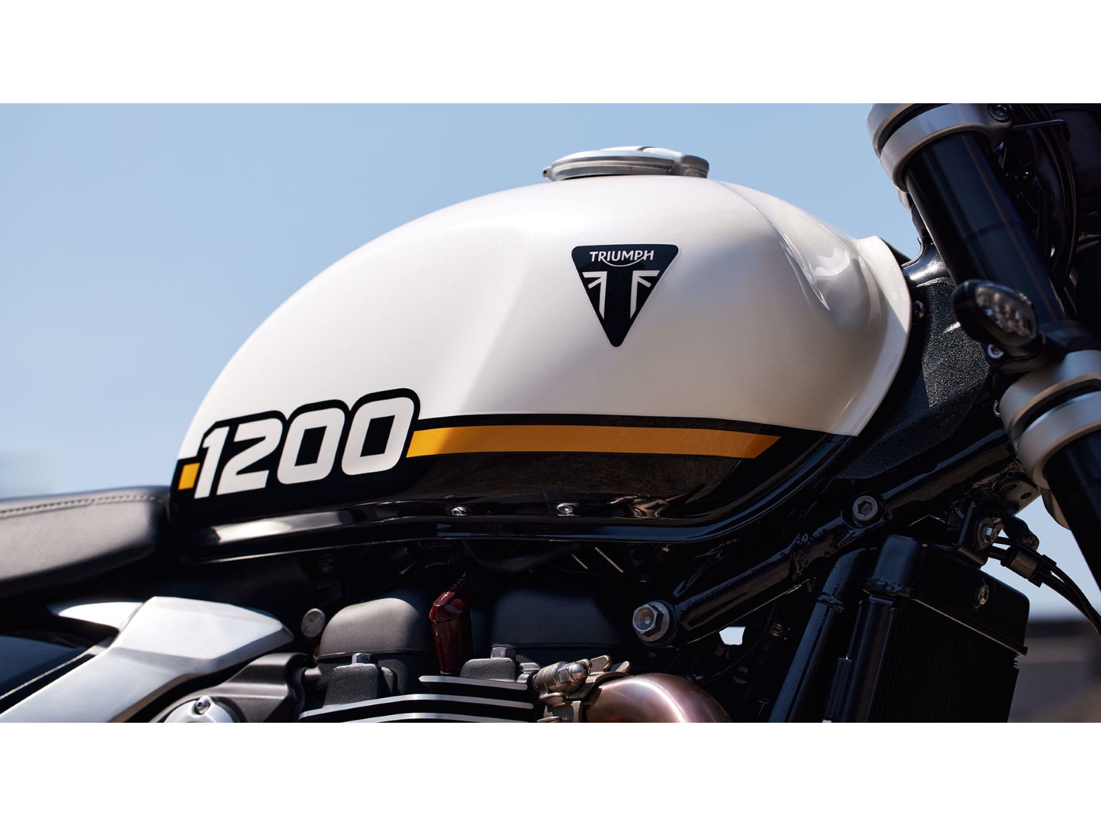 Stunning and uncompromising, the Speed Twin 1200’s sleek, minimal design has evolved. The raked fuel tank, with its deep front cutouts, is chiseled and muscular, while the minimal throttle body covers are finished in brushed aluminum and integrated seamlessly into sculpted side panels within the slim rear frame. Underneath, the lean, angular engine casings are powder-coated black and framed by an uninterrupted exhaust run flowing into twin upswept ‘megaphone’ silencers.