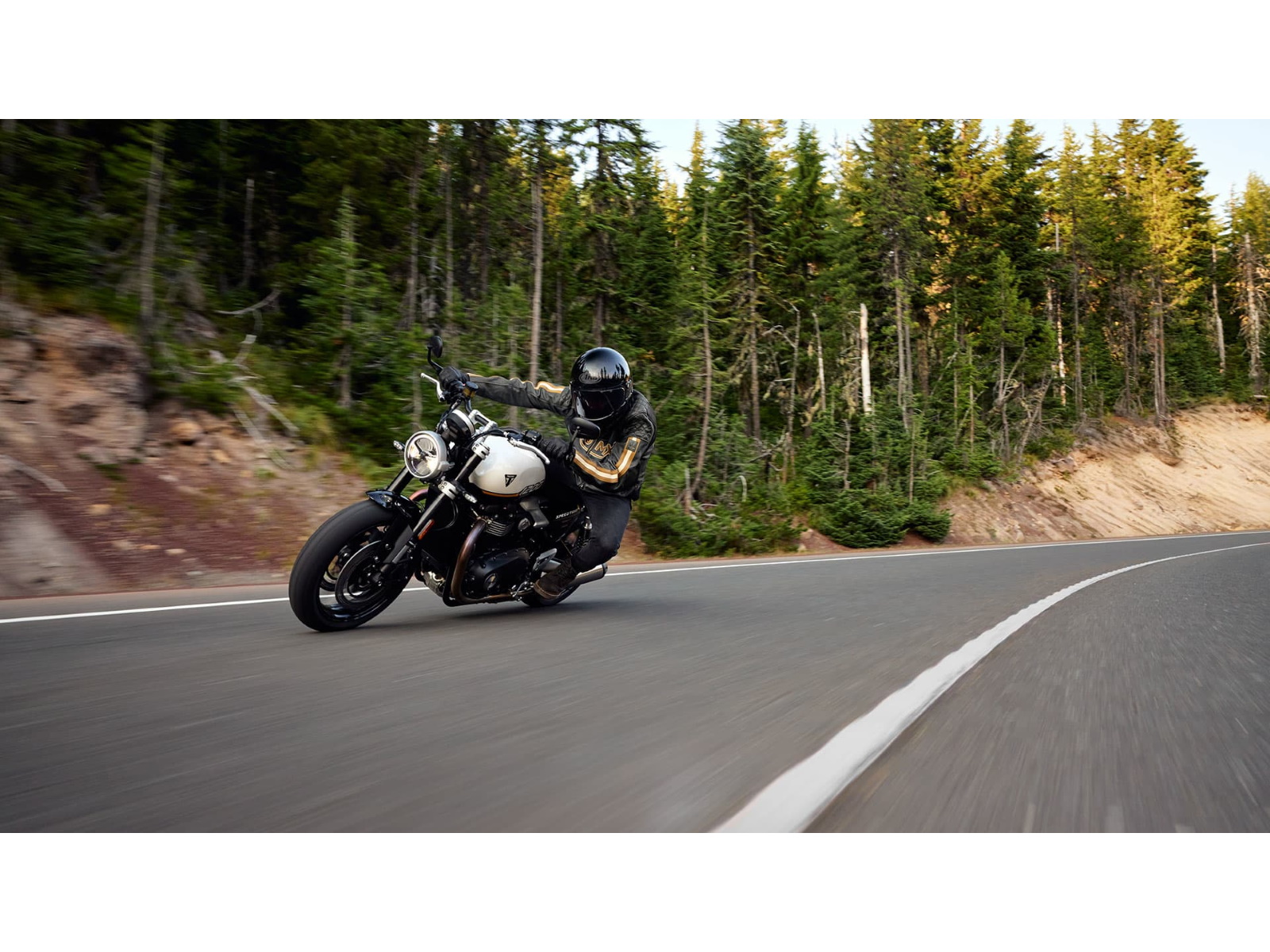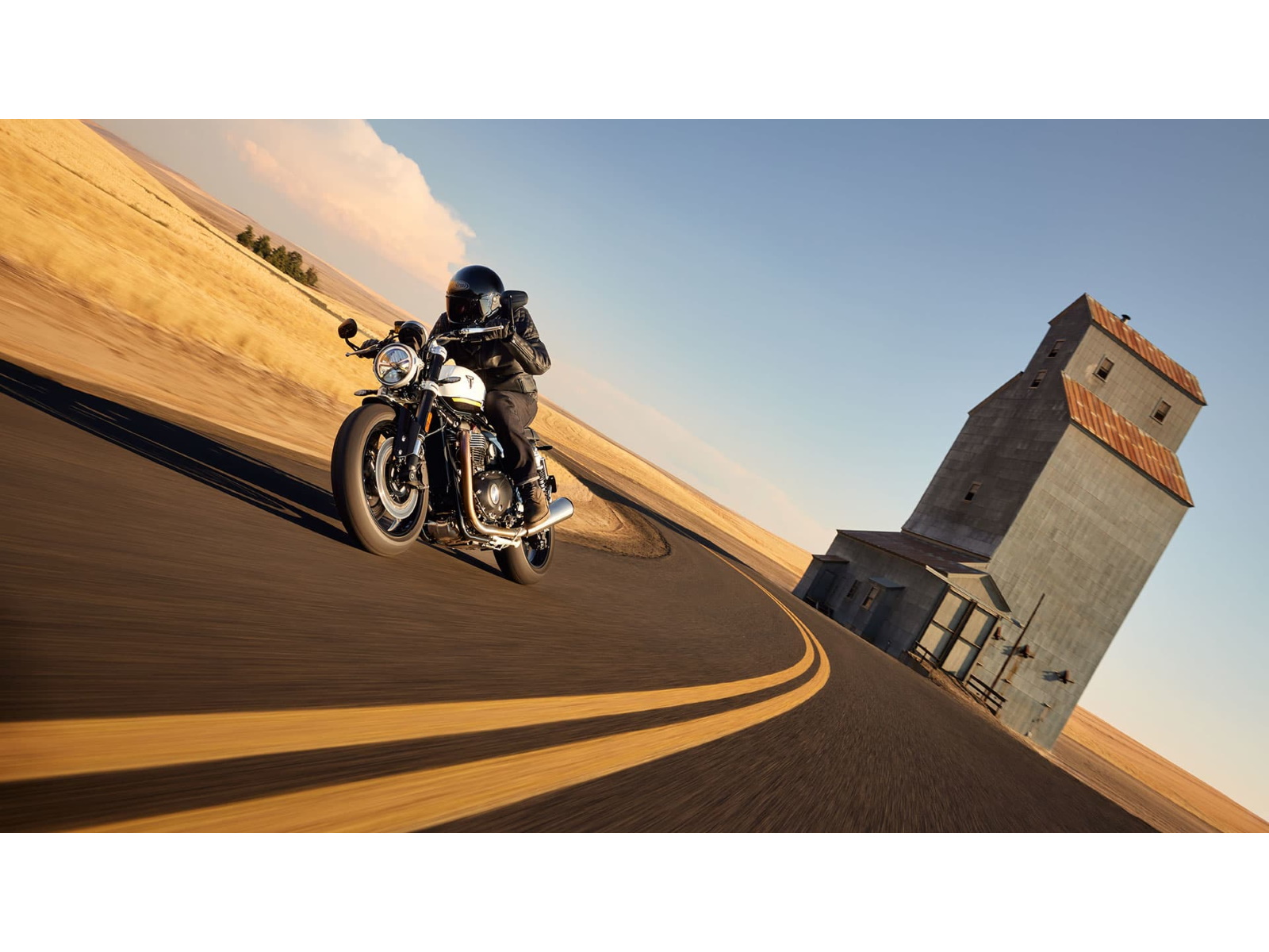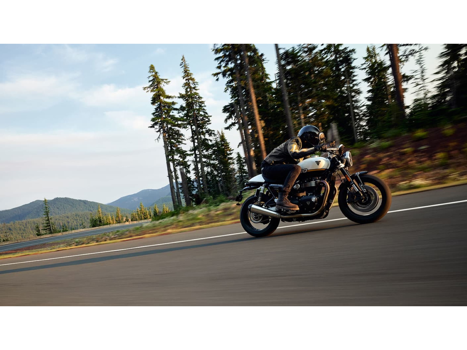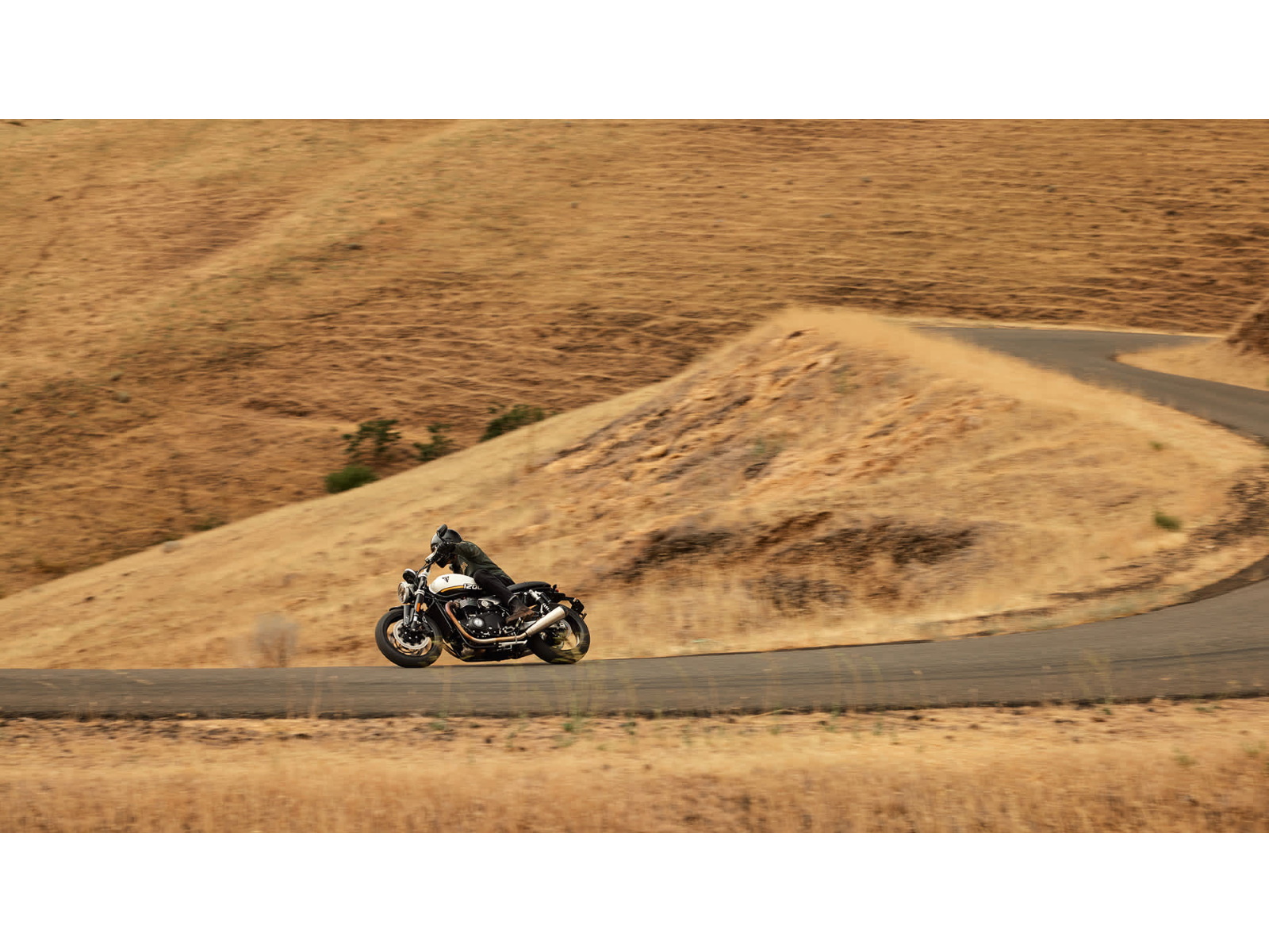 Stunning and uncompromising, the Speed Twin 1200’s sleek, minimal design has evolved. The raked fuel tank, with its deep front cutouts, is chiseled and muscular, while the minimal throttle body covers are finished in brushed aluminum and integrated seamlessly into sculpted side panels within the slim rear frame. Underneath, the lean, angular engine casings are powder-coated black and framed by an uninterrupted exhaust run flowing into twin upswept ‘megaphone’ silencers.