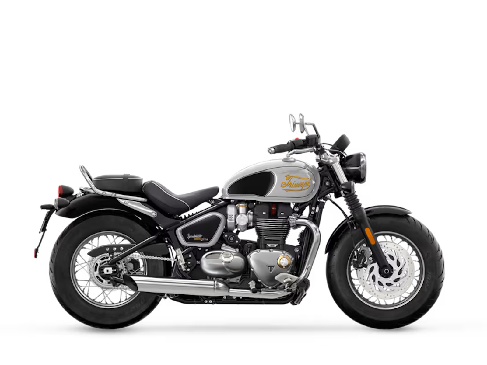 Authentic touches enhance the Speedmaster's iconic style, with minimal bodywork, a sculpted 3.17-gallon Bonneville tank, nacelle headlight detailing, and a distinctive hard tail look 'cage' swingarm.