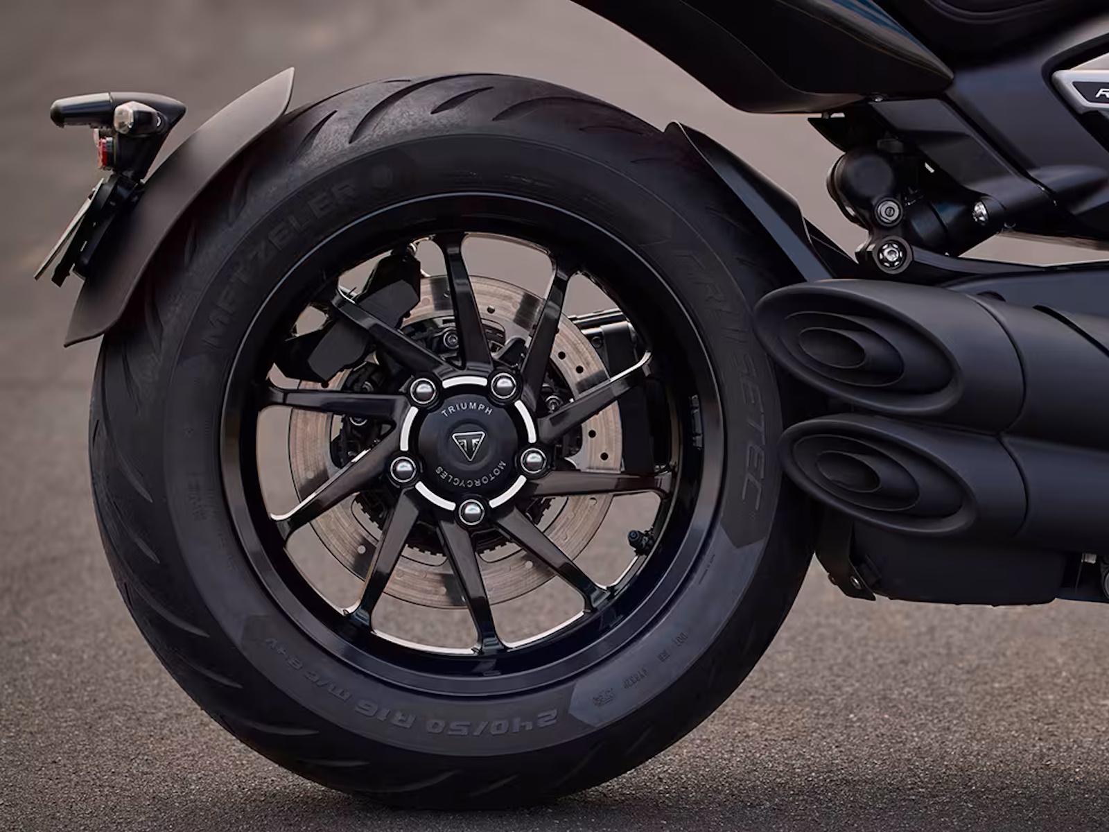 The lightweight sports-styled 10-spoke cast aluminum wheels contribute to the incredible agility of the Rocket 3 Storm and are finished in black for added attitude.
