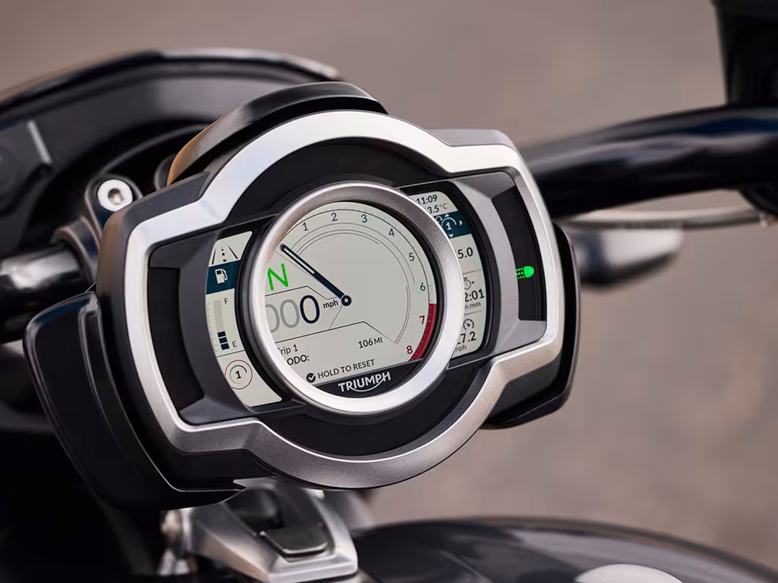 Powerful Triumph branded twin headlights combine with stylish indicators and an integrated rear light to complete the Rocket’s distinctive lighting signature.