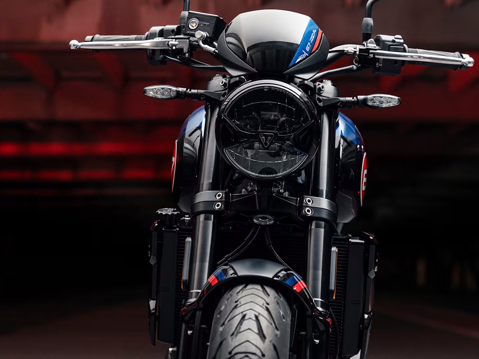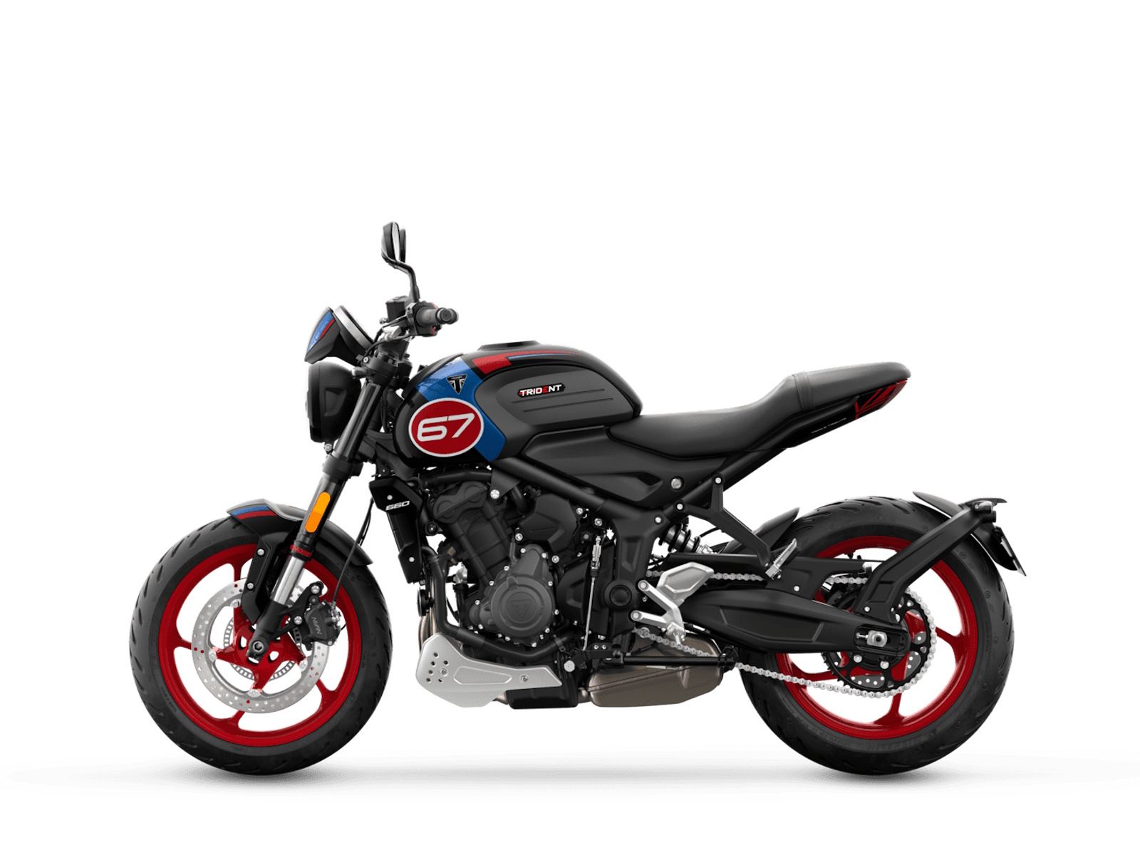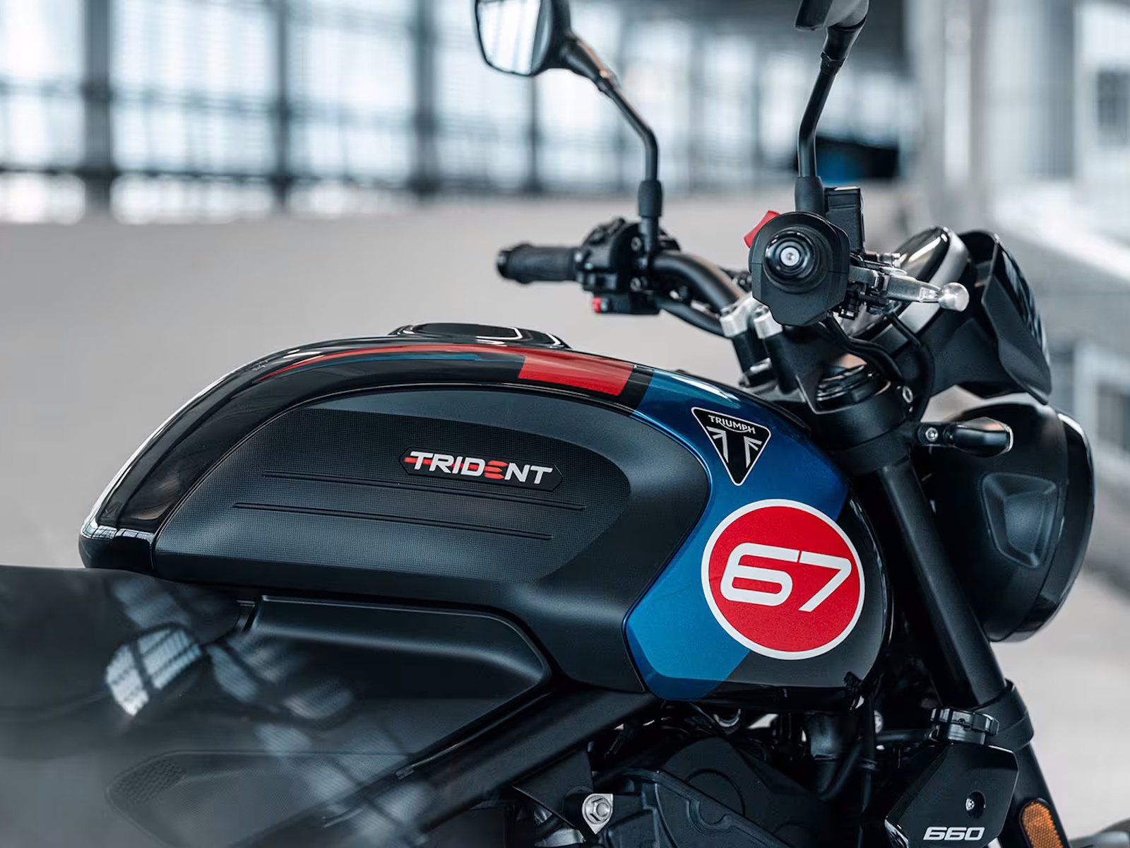 Bold Cobalt Blue and Diablo Red highlights sweep across the tank, tail, and front end for a striking combination that channels Triumph’s racing heritage and gives the Trident Triple Tribute unmistakable character.