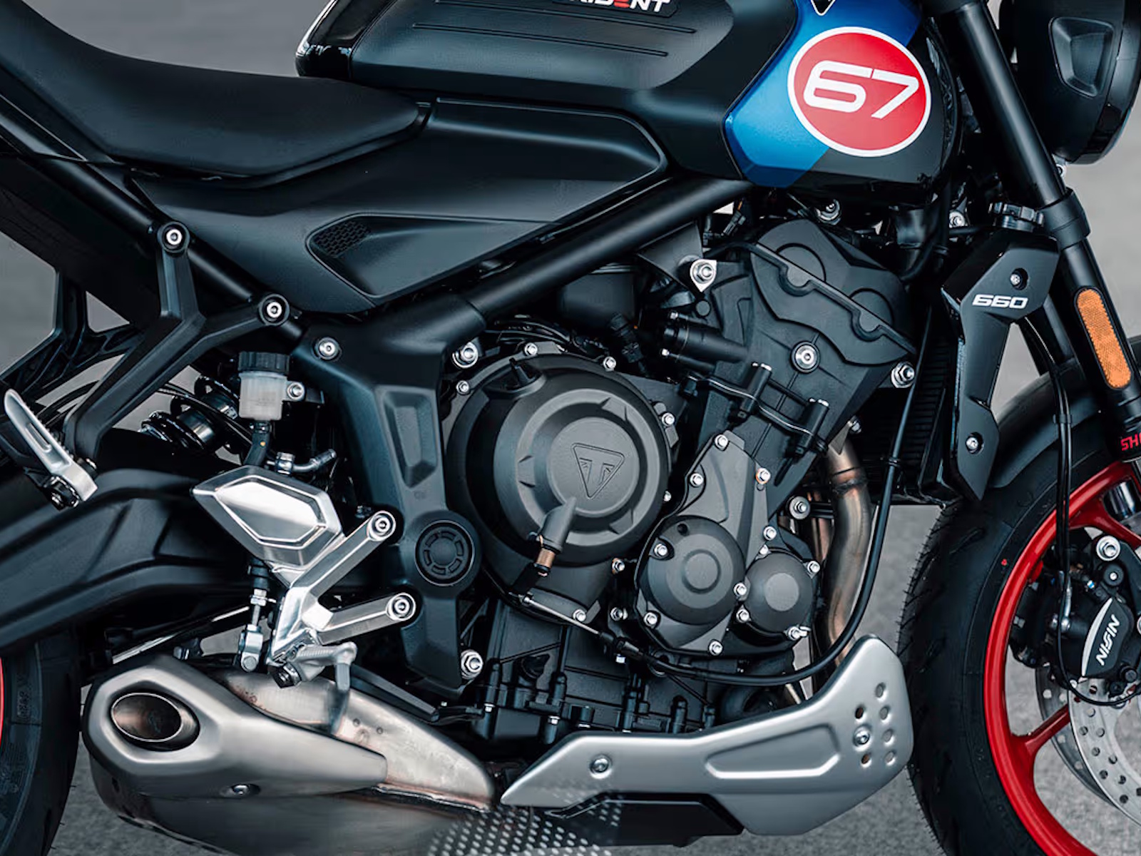 - The triple engine of the Trident is uniquely positioned between the torque of a twin and the top-end power of a four cylinder, delivering 79.8 HP and 47.2 LB-FT of torque for smooth, responsive performance across the rev range.