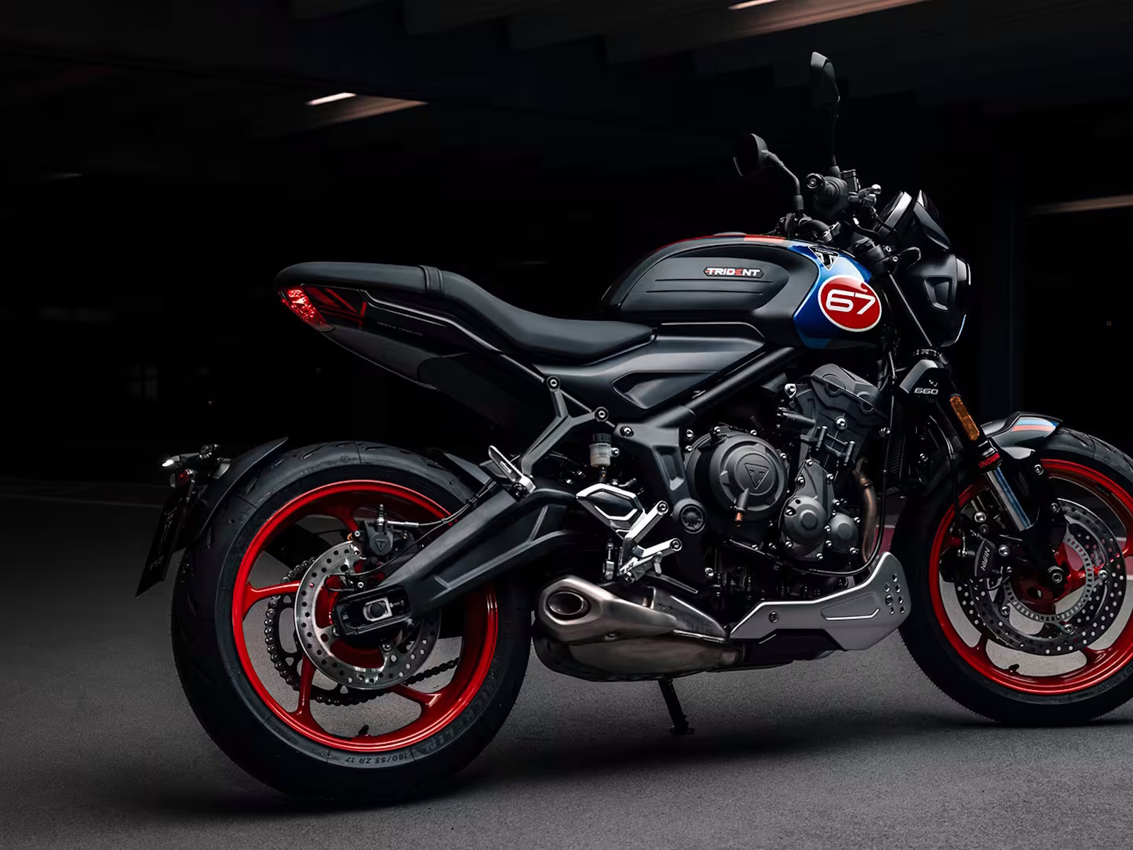 The striking red wheels give the Trident Triple Tribute an unmistakable presence, combining performance style with pure attitude.