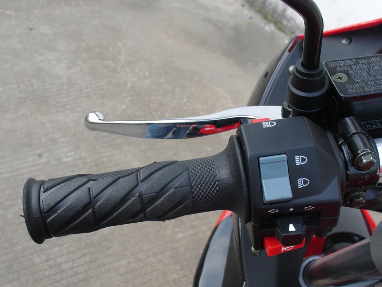 - Left handgrip control: Hi-Lo beam switch, turn signal switch, horn switch