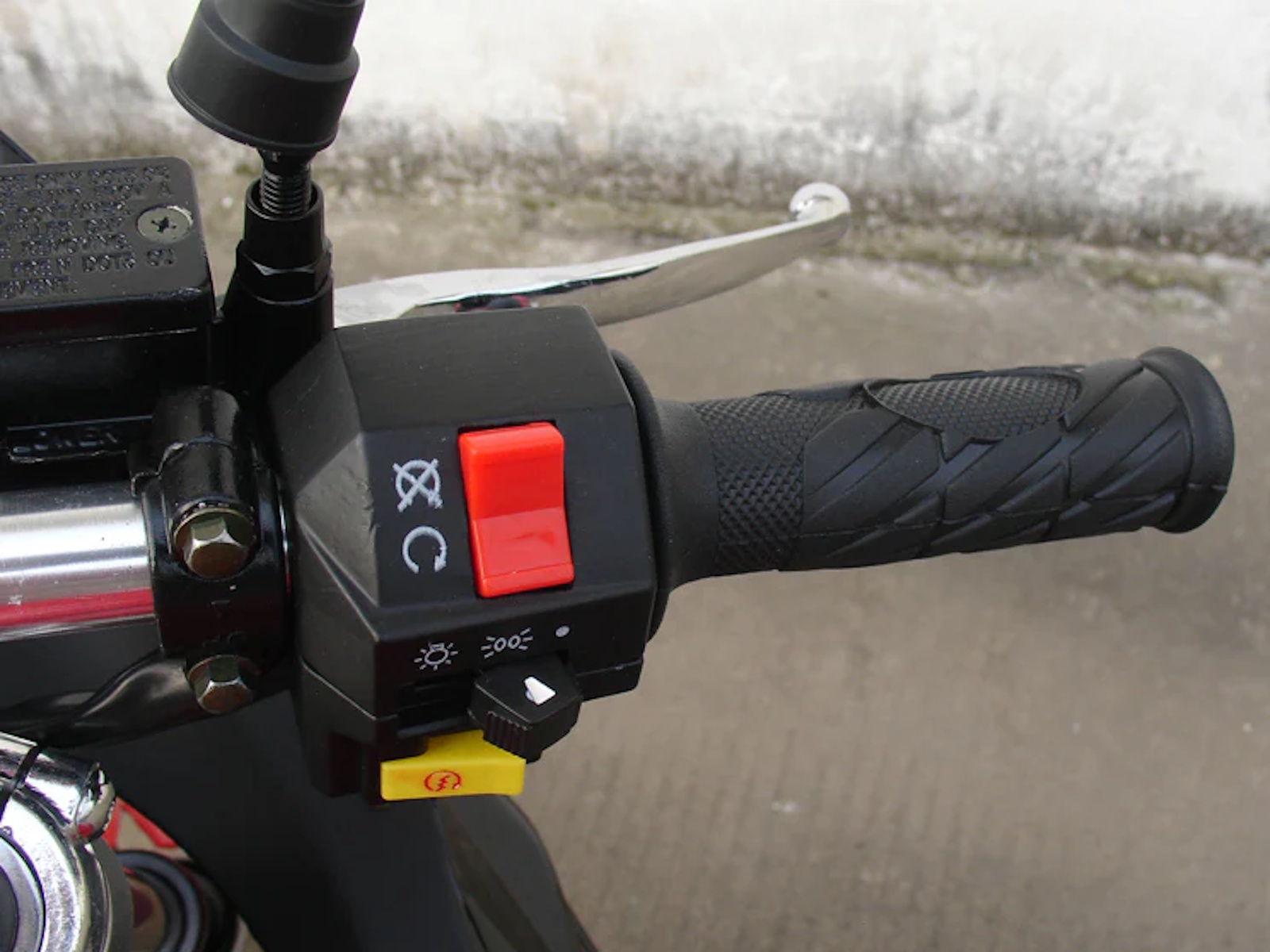 - Right handgrip control: engine kill switch, light switch, electric start switch