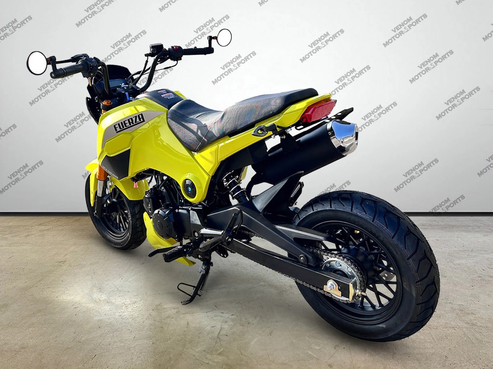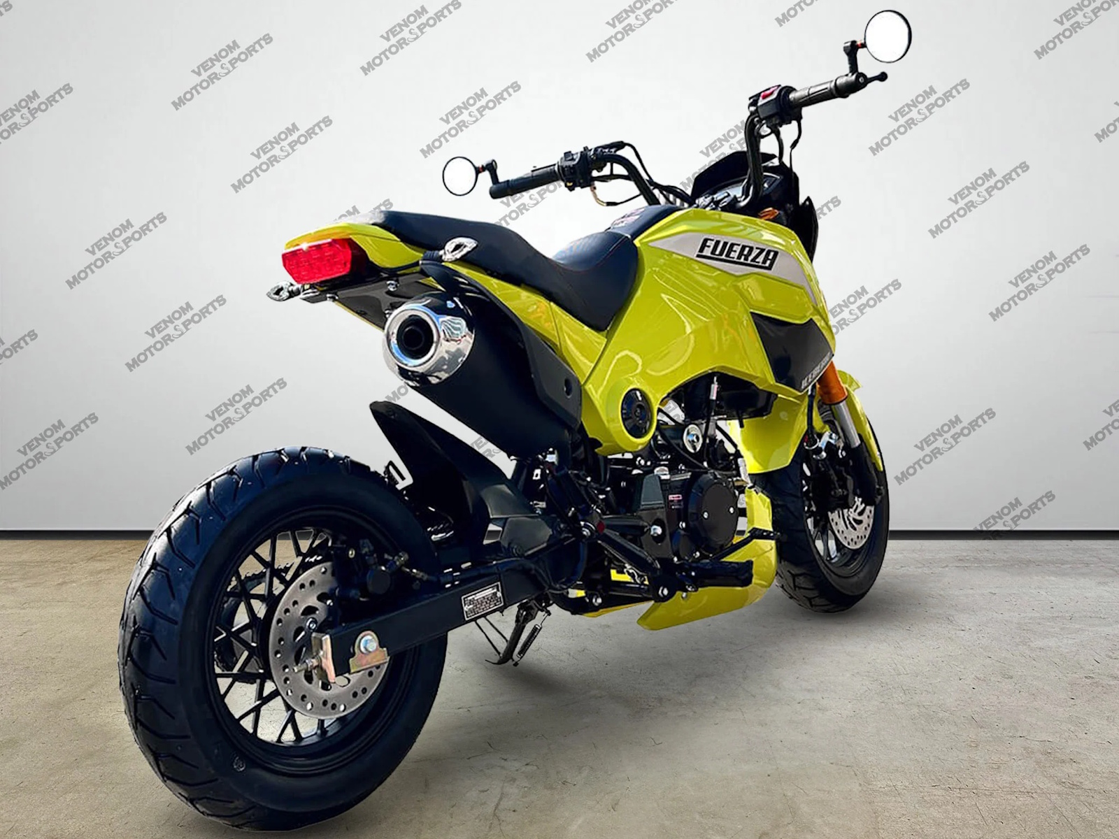 Featuring four eye-catching colors-- Red, White, Neon Yellow, & Black-- the Fuerza's ready for your ride. Upgraded hand grips on the left handle bar contain High/low beams, turn signals, a horn, & a choke open/close lever. Plus, the right handle bar has a kill switch and a one-push electric start to fire up your engine. Side view mirrors are mounted on both sides to keep you safe. You'll also love the upgraded performance exhaust with its beautiful bubbling sound-- whether idle or revving, Fuerza's 8500 max RPM & 4 down, neutral up gear shift pattern.